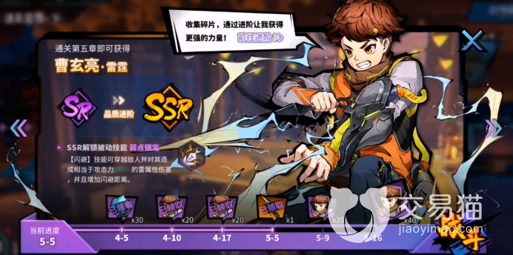 挑战完5-5之后,我们会获得一个神装舜天杀,它是一个专属攻击性武器,可以给对手带来致命伤害,继续可以慢慢挑战,再完成5-9以及5-16的之后,可以分别获得曹玄亮雷霆的碎片,最多可以获得60个,积累碎片我们可以直接将这个角色升级到ssr,被动技能也将提升为弱点锁定,可以更好地进行输出,提升攻击力,拥有强大的威力。