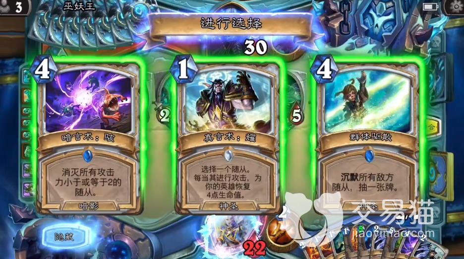 巫妖王的1阶段是常规释放技能,在此阶段,巫妖王会把手牌中的第一张牌变成作弊牌,原来的牌会加入洗牌库,作弊牌在第一阶段巫妖王一定会使用。要注意,当巫妖王达到7点费用值的时候会把霜之哀伤放到手牌中,并且立刻装备。9职业的作弊牌也各有不同,今天主要介绍牧师,牧师的作弊牌是【闭嘴,牧师】,这个牌的功能就是字面意思。