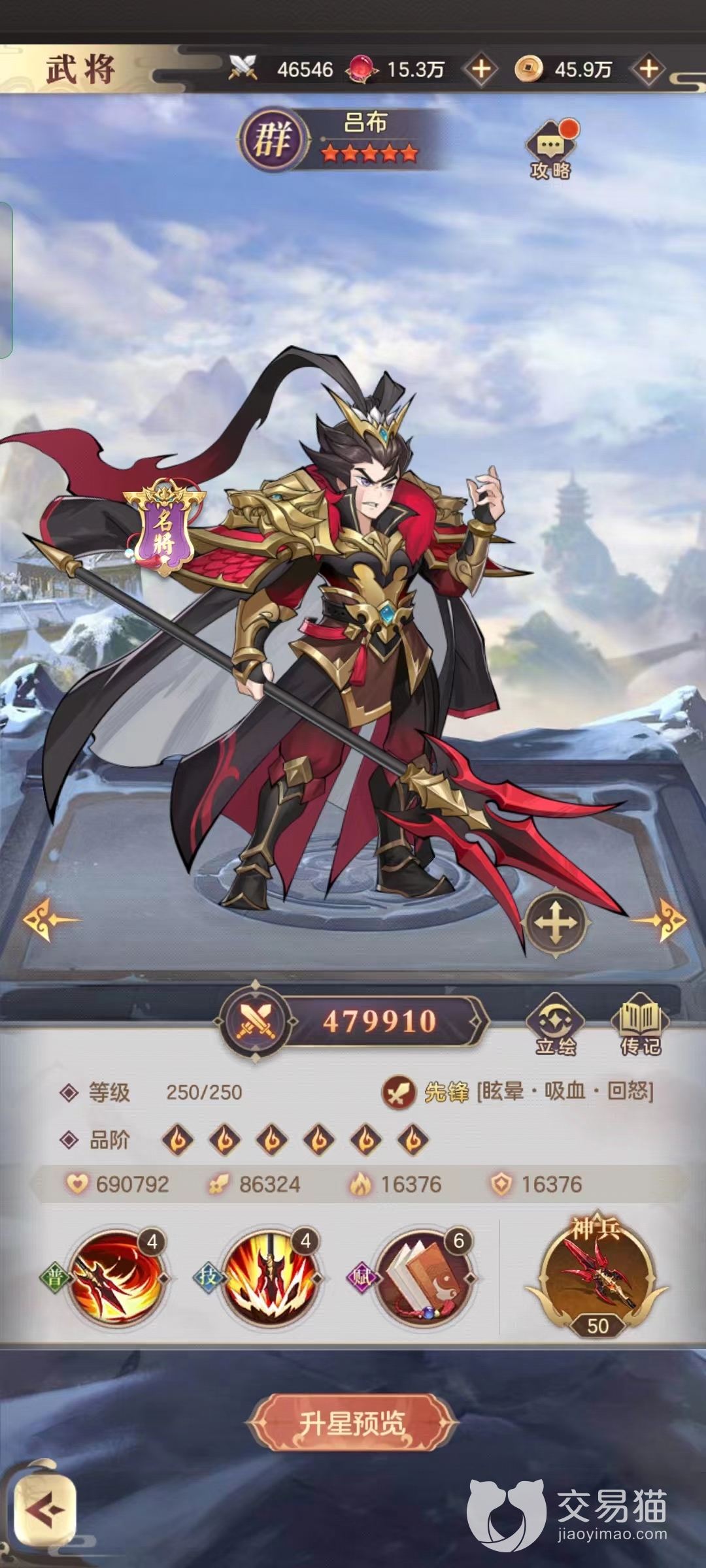 吕布是一位6星的武将,6星在游戏中也是星级最高的一批猛将了,最高可升至10星。从这个角度看吕布在本作中是妥妥的T0。毕竟星级越高,吕布的上限也就越高。