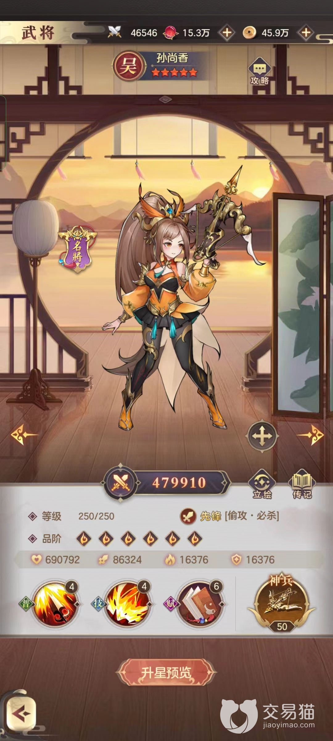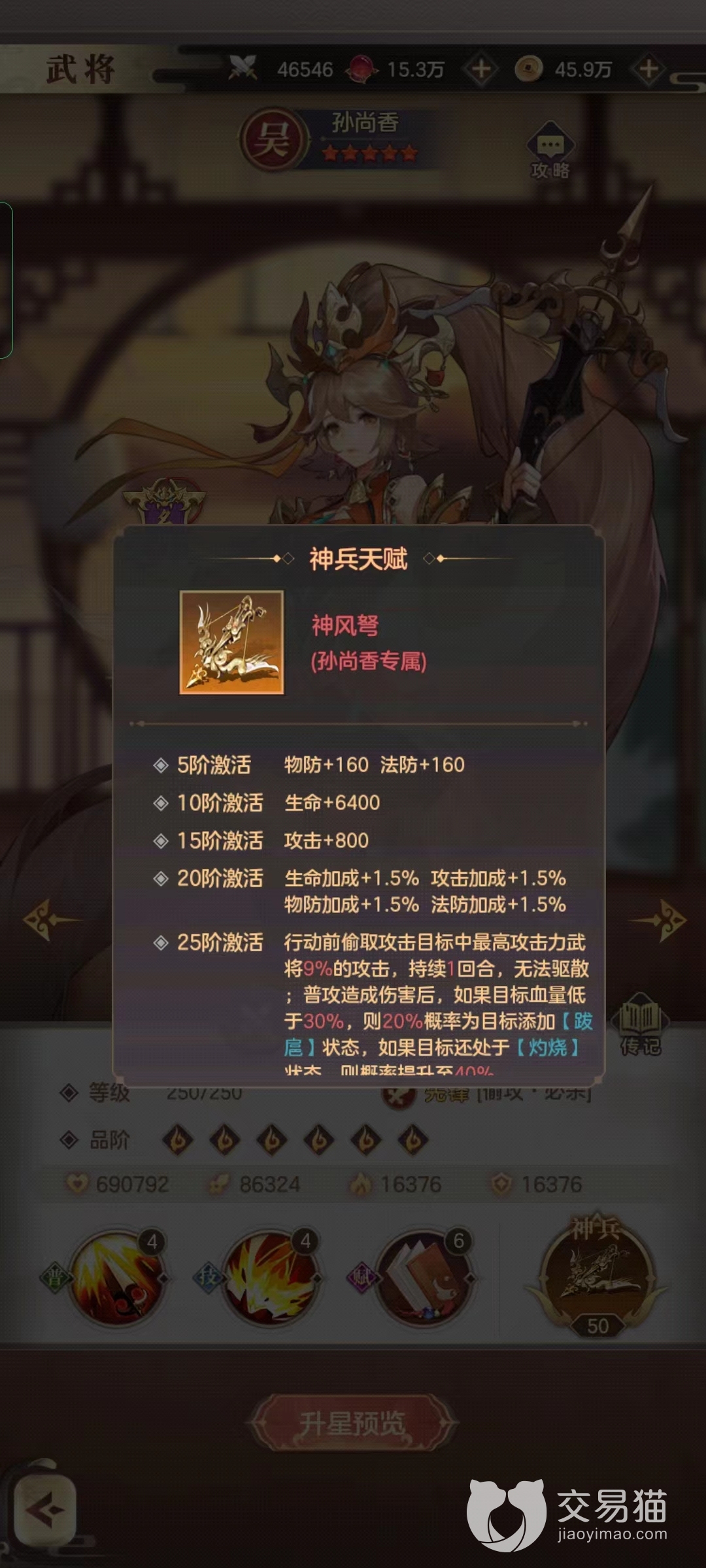并且如果目标处于灼烧状态,那么就可以百分百的斩杀目标。也是因为这个机制,可以以孙尚香为绝对核心打造一支灼烧流的队伍。如果后期将孙尚香培养到25阶,自带的神兵天赋可自己灼烧状态,非常的强势。