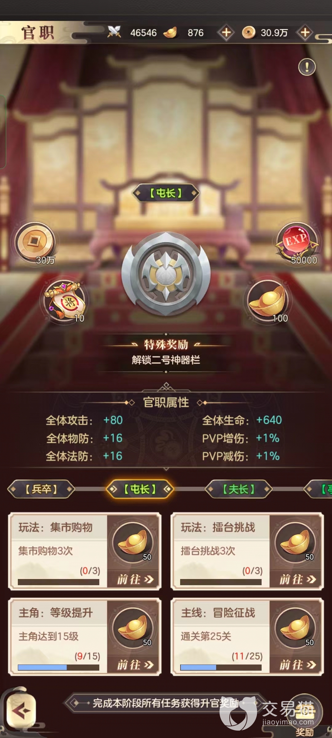 看着这么多的奖励,玩家们都忍不住想当大将军了吧。有一个好消息就是玩家的升官之路并不难,只需要完成对应官职的四个升官任务。而这四个升官任务也和玩家当前等级玩法有关,比如兵卒升屯长只需要招募三次武将、升级武将、升级角色并征战到10关。玩家可以把官职系统认为当前游戏阶段的任务教程,而那些奖励几乎就是白给的。