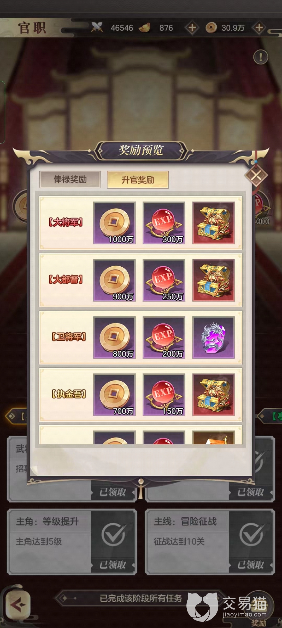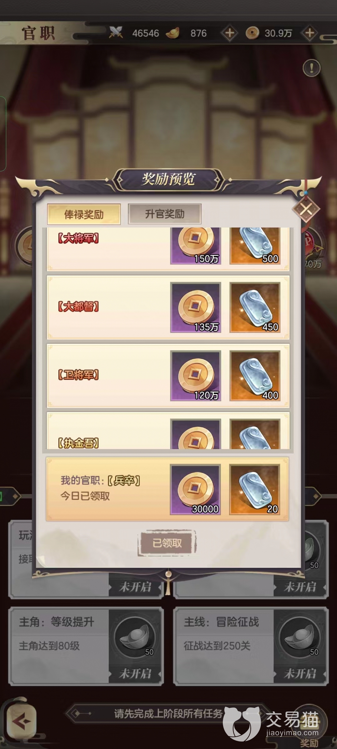 除俸禄奖励外,游戏为了鼓励玩家们升官,玩家们每次升官还可以获得升官奖励。升官奖励必带铜钱和武将经验,另外还可解锁神器、神器格子、兵法或是战将等等,这些道具都是游戏中非常稀有的,终于知道古代为什么那么多人敲破头也想当官了。