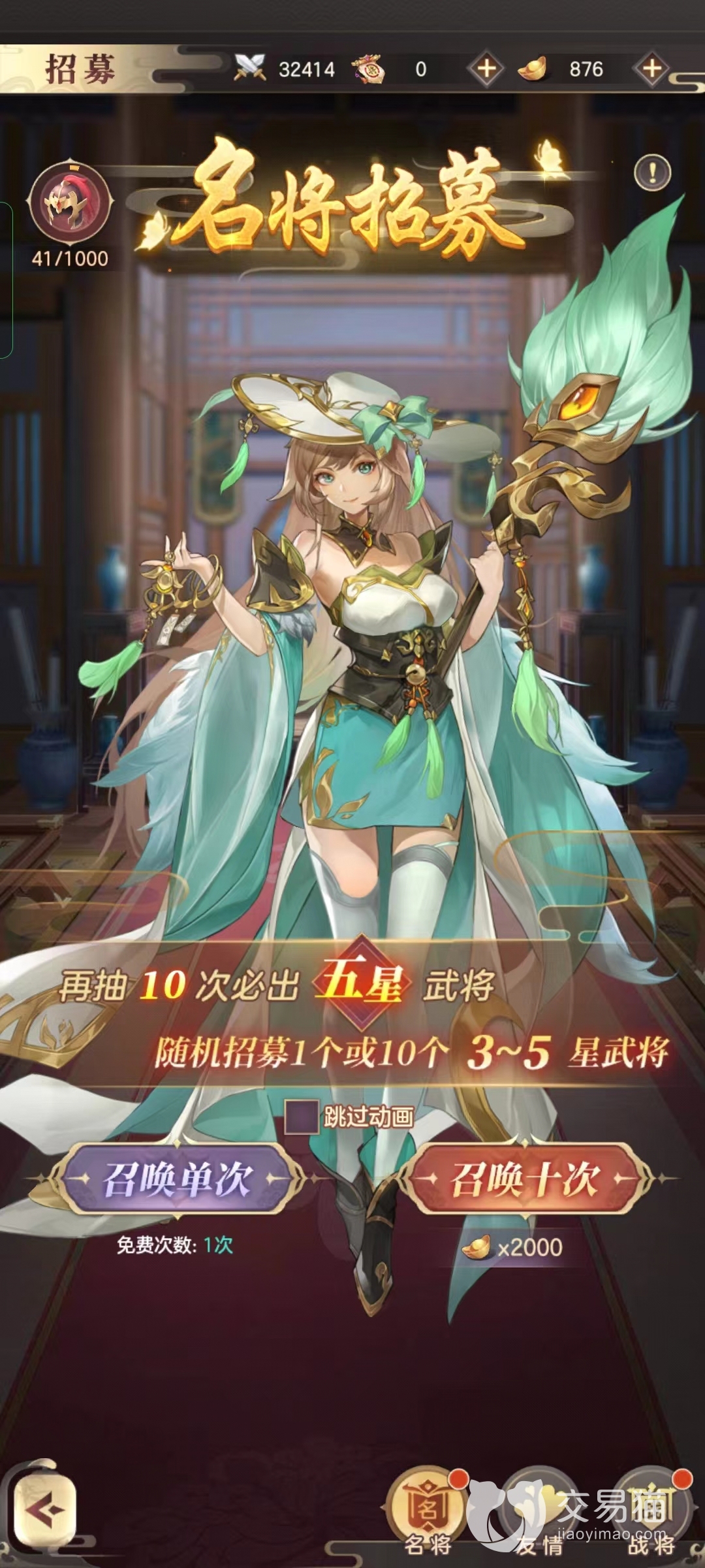 第二种就是每次花费100点友情值,召唤一个2-5星的武将。最后一种点击战将,花费一本战将册召唤随机的1-5星武将,和第一种方式一样,战将招募的话每18小时可免费抽取一次。