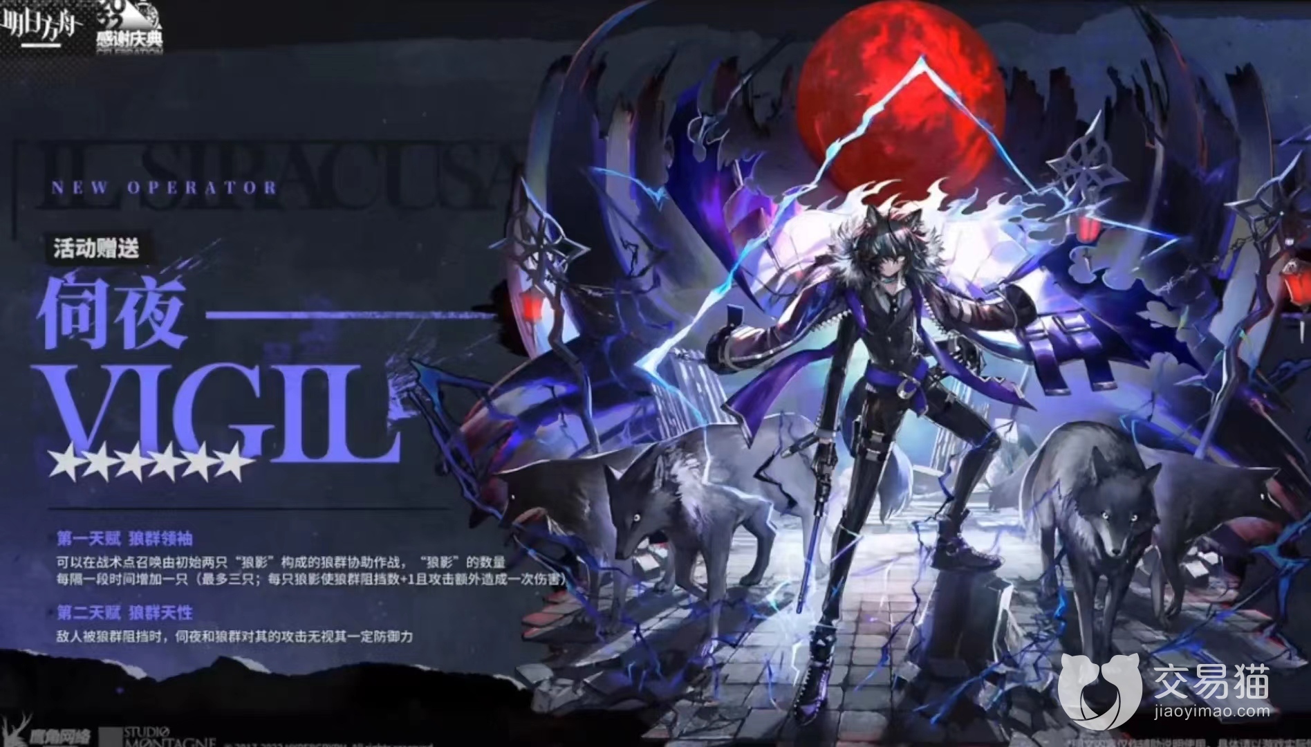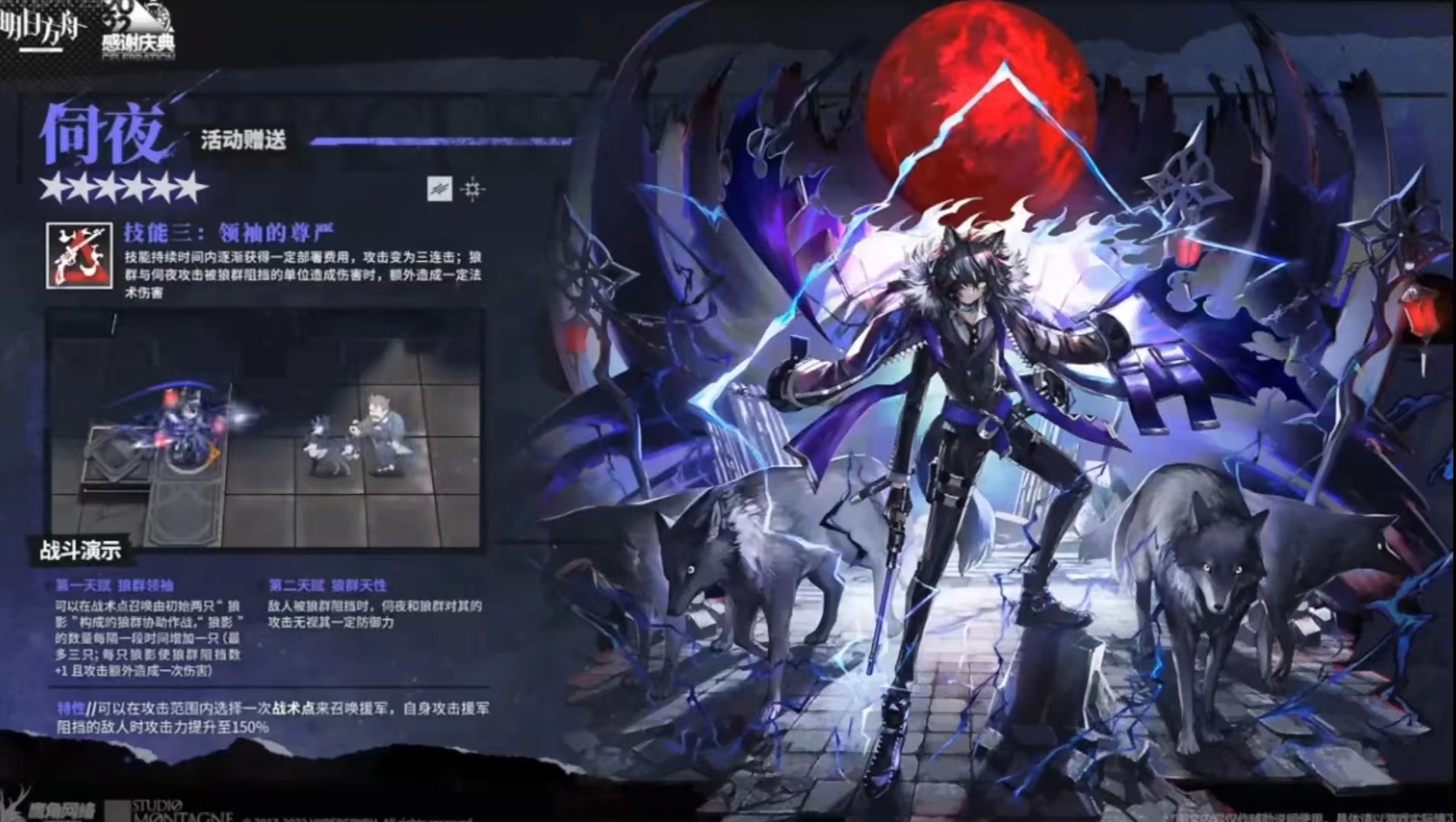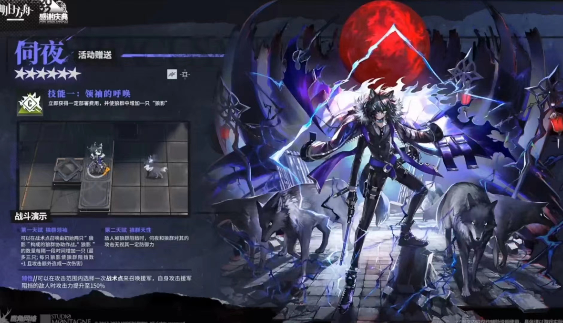 作为六星干员,伺夜拥有两个天赋,第一天赋狼群领袖强化战略点,伺夜可以在战术点部署一群狼群,狼群由狼影构成,再受到致命伤后可以通过献祭狼群来保护狼群,每隔一段时间会召唤一个额外的狼影,在首次部署狼影时会额外获得一个狼影,每个狼影都会使狼群的部署位增加,攻击次数增加,狼群最多可以由三只狼群构成。