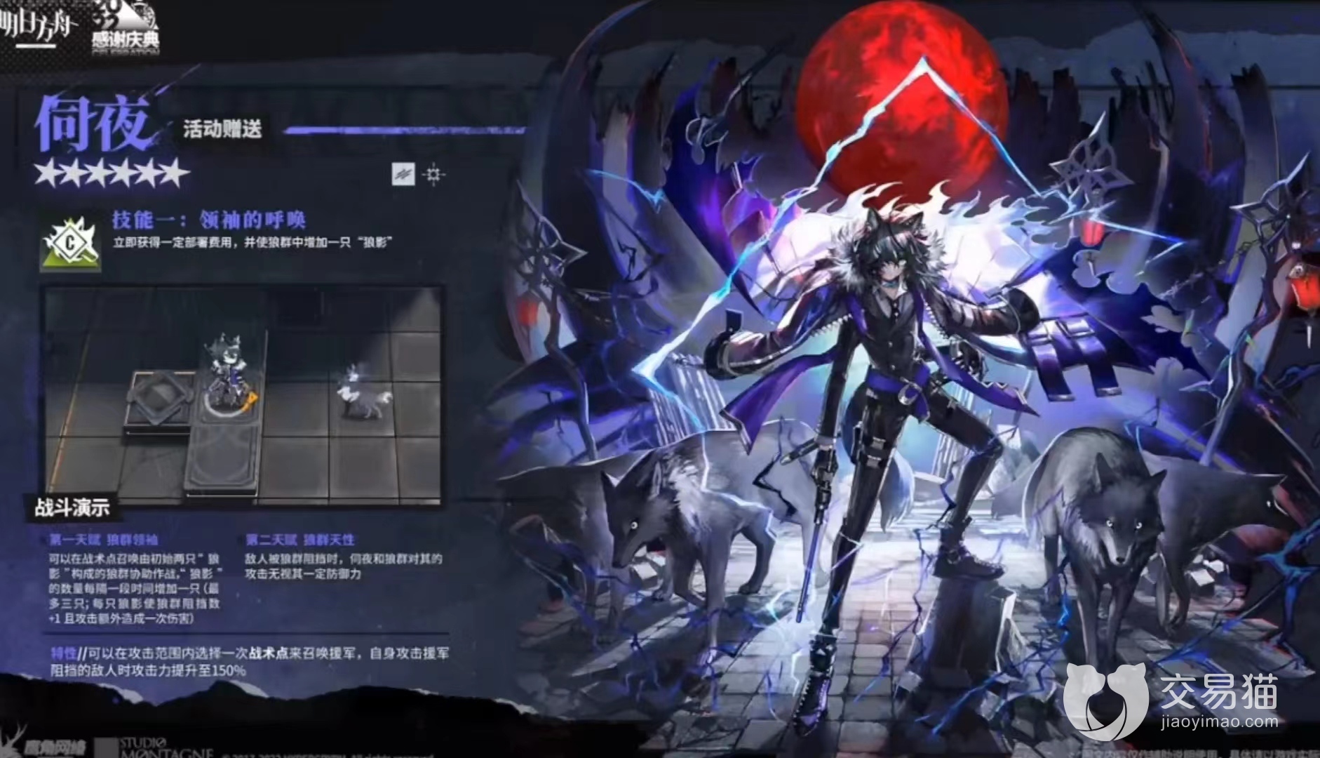 伺夜一技能领袖的呼唤,在技能开启后,伺夜会立即获得一定量的部署费用,并且为狼群增加一只狼影。这个技能是很普通的费用回复技能,没什么需要多说的,如果技力需求较低的话,可以在前期快速增加狼影补充队伍伤害。