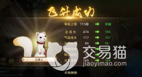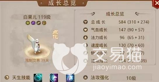 白果儿拥有超强的群体攻击,法攻初始成长数值为75,总属性成长达到310。通过点化丹,它全部属性增强30%,消耗点化丹24.5颗。在飞升之前,它最重要属性为速度、法攻、气血。它飞升、强化之后,法攻属性每次提升6点,最高提升上限为10点。白果儿最多能够强化十次,整体花费不算高,值得玩家们投资。