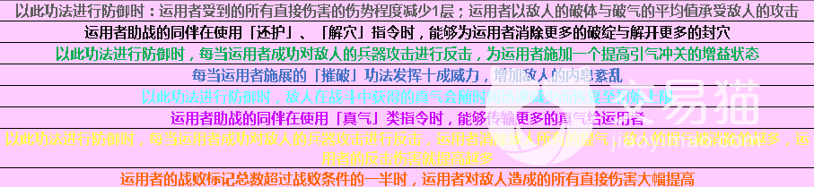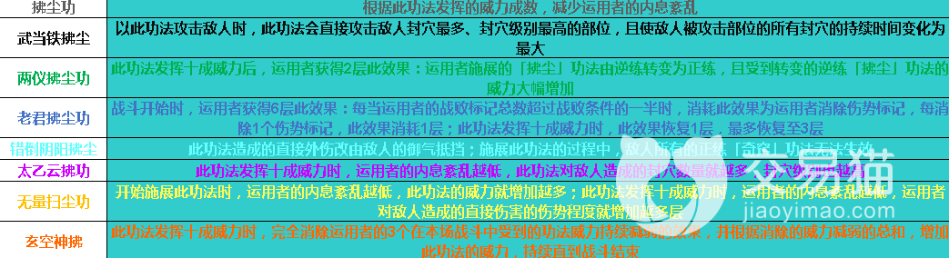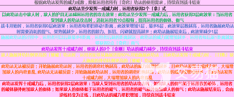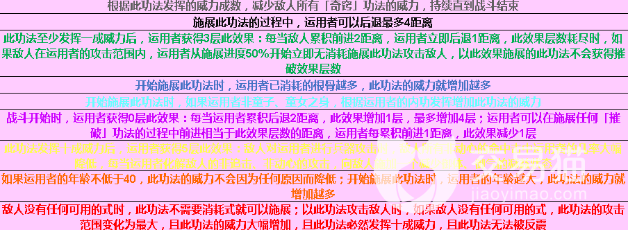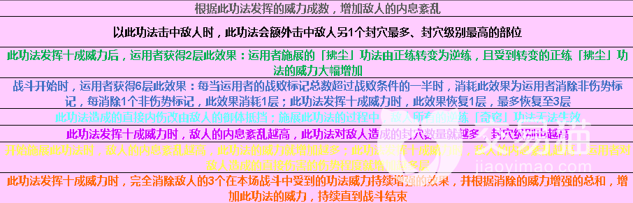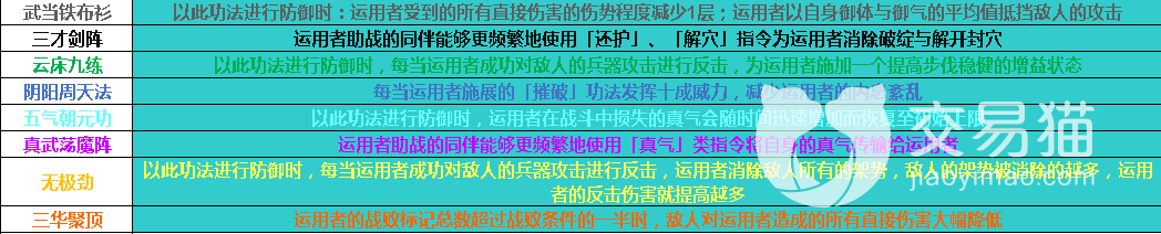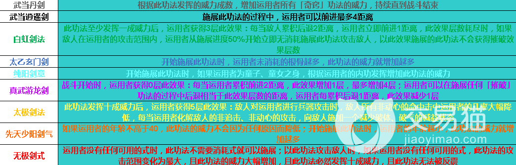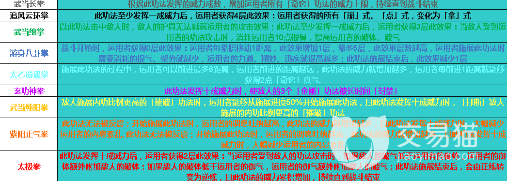 武当太和功:正练增加运用者的「武当派」功法的威力上限,逆练降低运用者的「武当派」功法的使用需求。