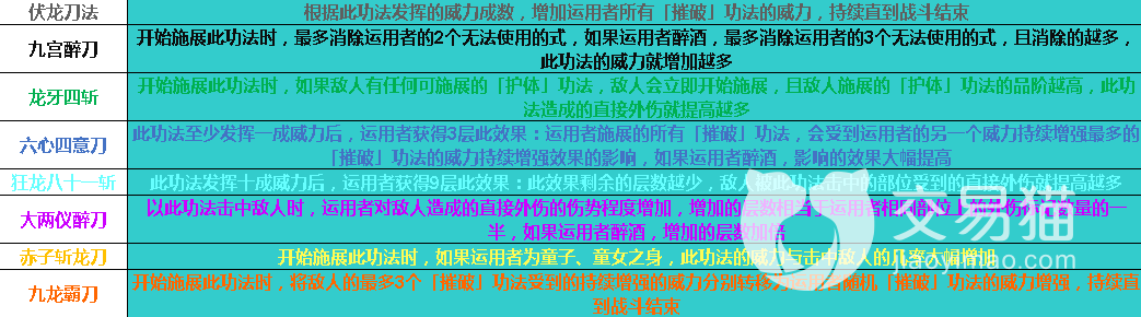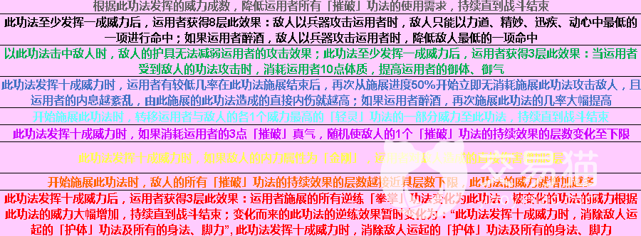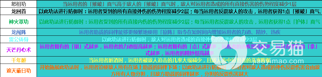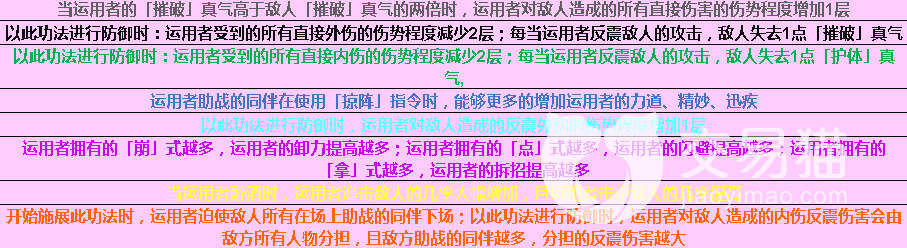 九龙归一功:正练将运用者除了「内功」以外的「纯阳」类功法的「逆练」效果转变为「正练」效果。逆练将运用者除了「内功」以外的「纯阳」类功法的「正练」效果转变为「逆练」效果。