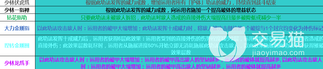 静禅功:正练增加运用者的「少林派」功法的威力上限。逆练降低运用者的「少林派」功法的使用需求。