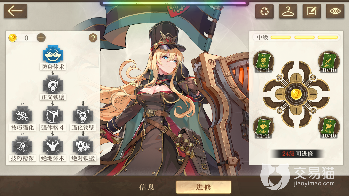 然后就是点击下面的进修按钮,玩家需要刷到足够的书就可以升级了,每次升级属性都会提高,提升一个大段就可以获得点数提升左边的技能,也可以获取特殊的书换技能点当然比较昂贵,可以用体力刷书慢慢点技能。