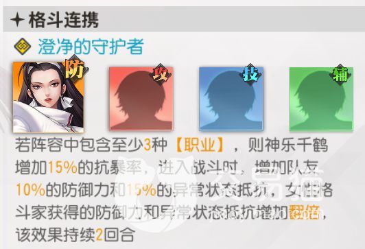 一套可以用到游戏关服的队伍当然不会是浪得虚名,首先神乐的连携触发可以直接为己方全体提供防御和抗性属性加成,女性角色直接获得双倍,并且这是一个开局被动可以直接触发,直接提高六人生存性的技能让她成为了当之无愧的女队前排第一核心坦位;之后就是雅典娜以及琼了,同时位我方所有女性角色加格挡率,抗暴以及伤害减免,说句实话,照这种加法,后排再脆弱的输出位都能变成铁巴,整支队伍在任何情况下的发挥都不会让人失望,除了练度差距过大导致的直接碾压以外,基本可以胜任绝大部分工作。