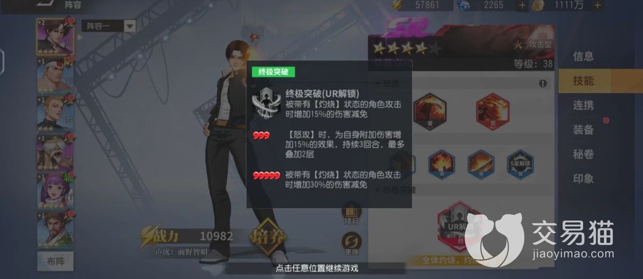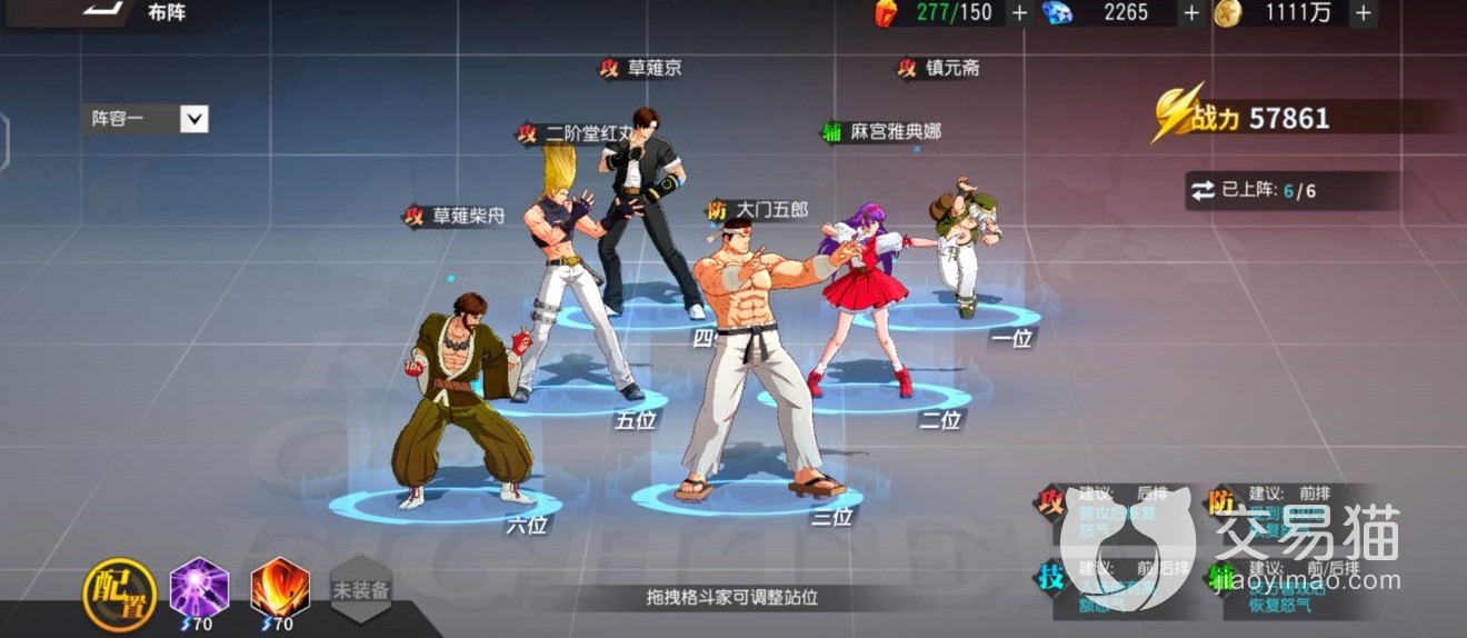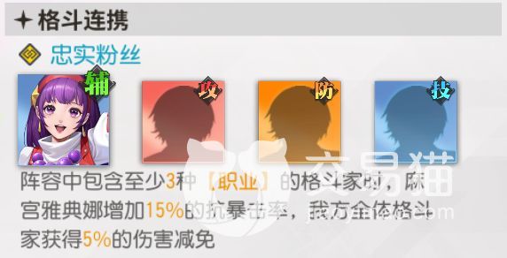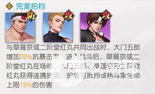 本阵容的主要特点比较类似于火队的简易版,整支队伍中的主C角色一眼就可以看出是草薙京了,作为想要组火队的玩家来说,想在开局找一个能抗住火队输出大旗的人,他绝对是最佳人选。再加上与五郎及二阶堂凑出的连携,让输出位置的坦度提升了很高,同时配合上五郎自身的减伤,前排护盾技能,就不用说队伍中还有雅典娜以及镇元斋,全体减伤加超高格挡概率,绝对能够为己方的后排的角色提供一个安心而又舒适的发挥空间。