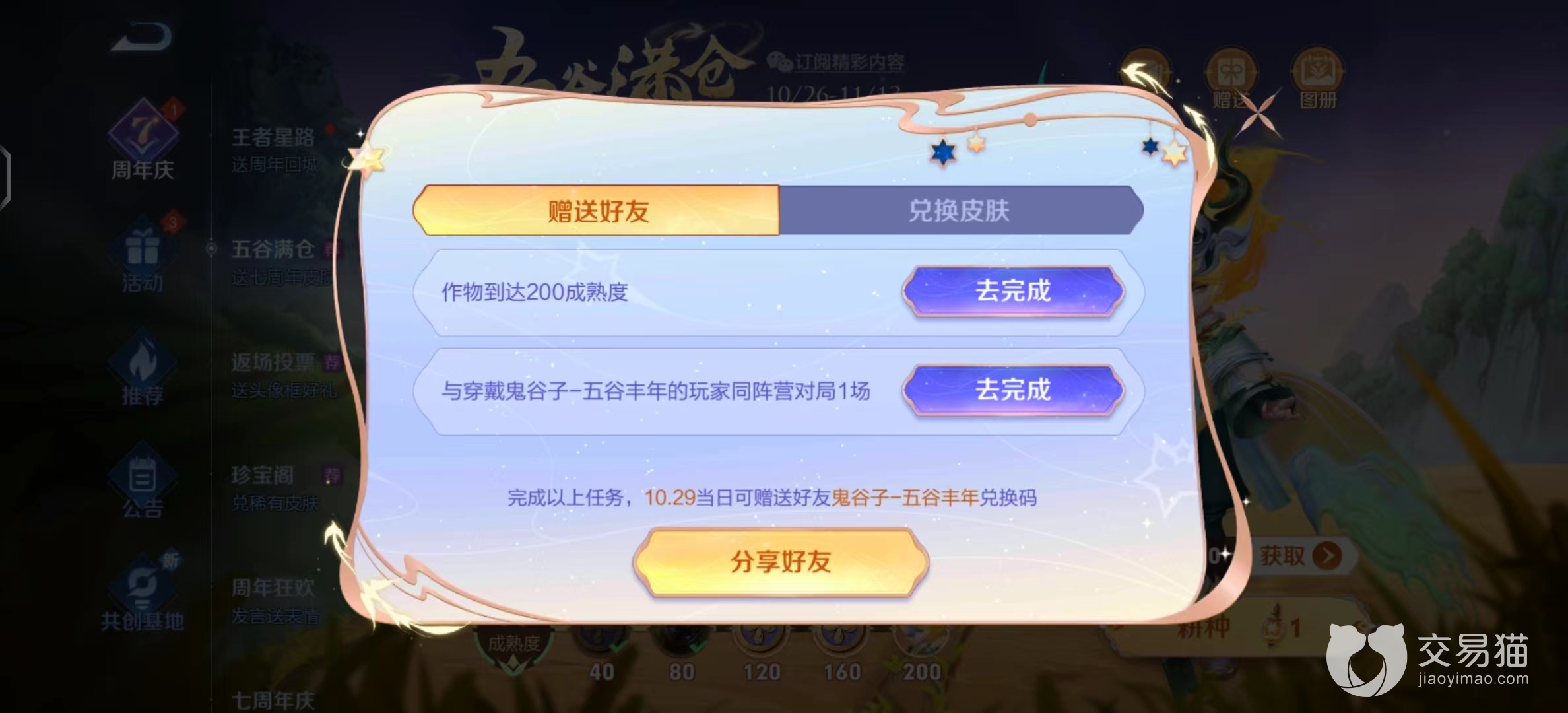 当你的好友已经达到了200点的成熟度,并且和使用此皮肤的玩家参与一场5V5对局,就可以生成兑换码,而他的兑换码可以让你在不完成任务的情况下直接获得鬼谷子新皮肤,以上就是小编带来的王者荣耀鬼谷子周年庆皮肤怎么获取相关信息,希望大家可以成为朋友圈中第一个晒出皮肤人。