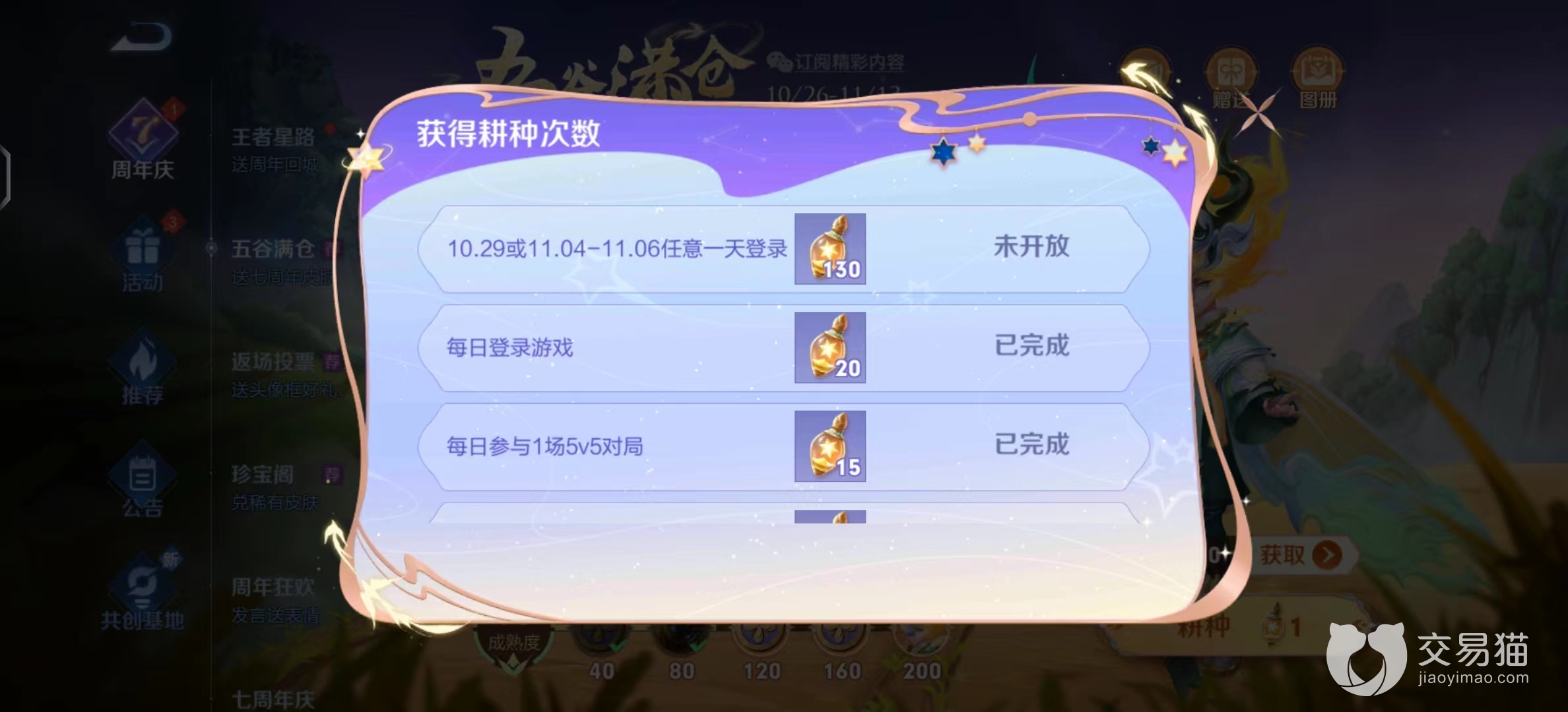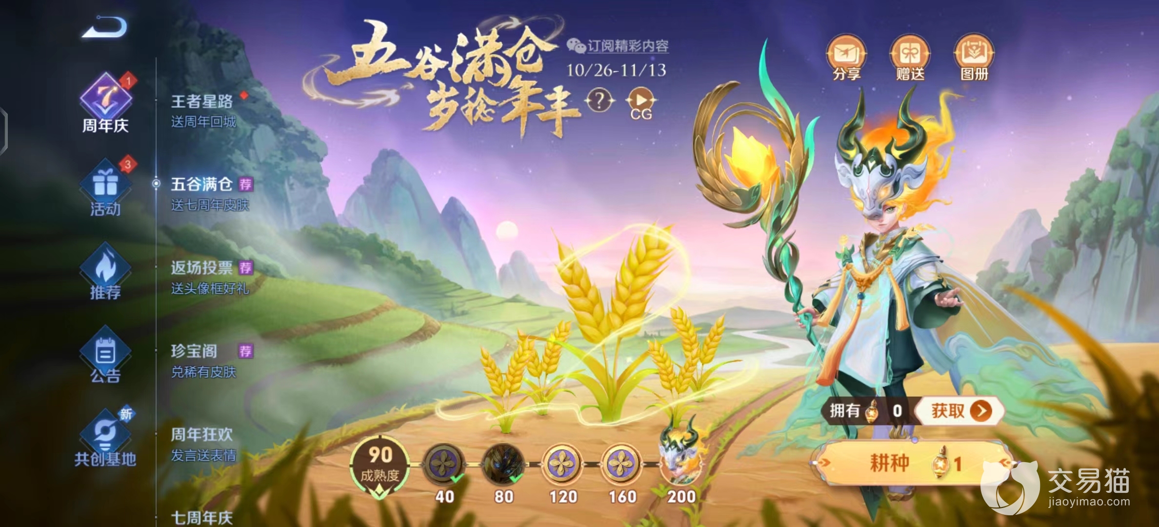本次活动的主题为:五谷满仓-送七周年皮肤,活动时间截止到11月13日,时间整体还是比较充裕的,即使没有时间每日登陆的玩家,按照小编的办法,也可以轻松获得新皮肤。