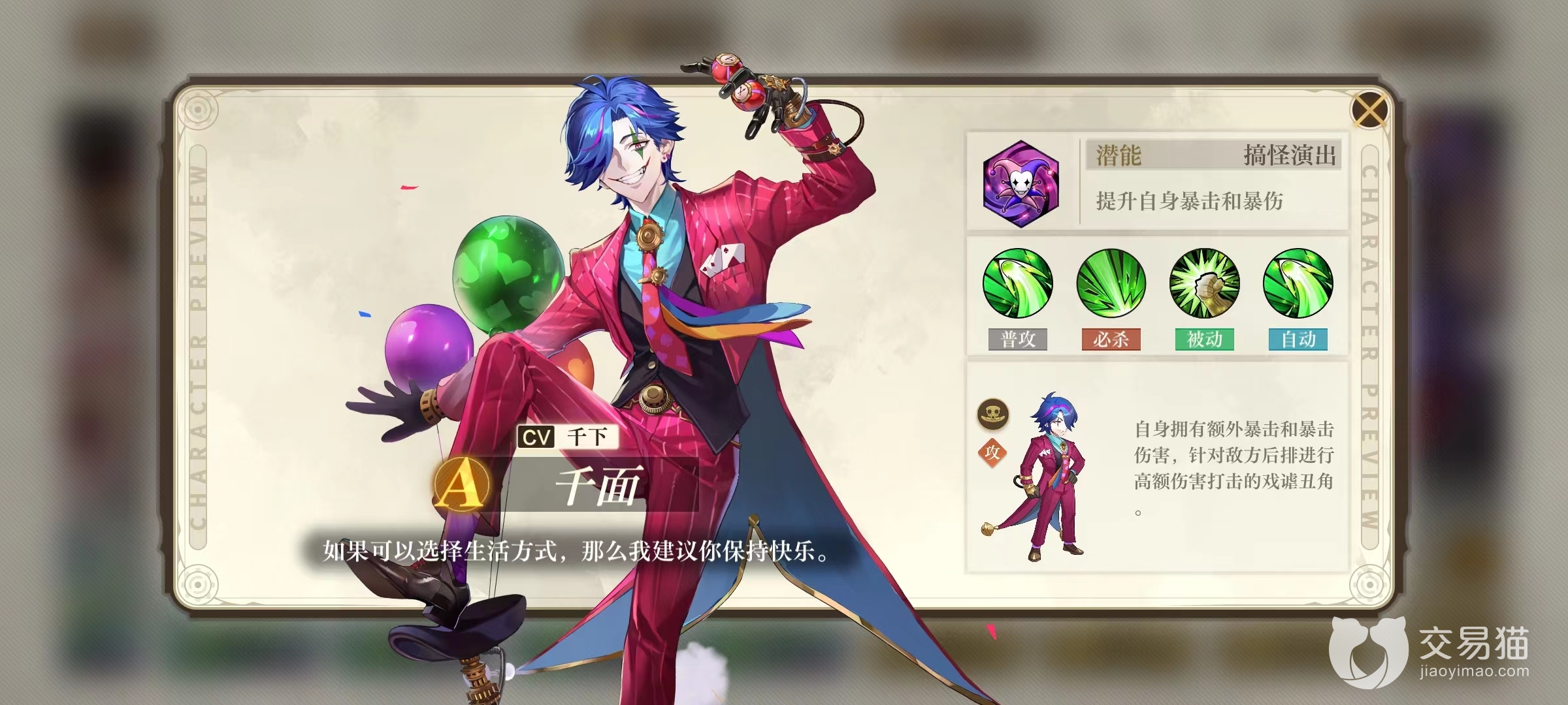 千面即一千个面孔,非常符合他魔术师的身份。他的普攻也非常有趣,每秒投掷三个杂技球,造成100%的伤害。虽然千面的普攻机制一般,但是强在其被动和必杀技。