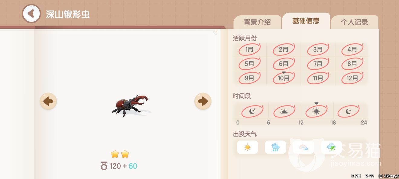 在温泉山附近注意是否有会动的草丛,这里就会有蝗虫,这时候玩家只需要走到草丛的其那面将其吓出来,然后进行捕捉的成功率相对较高。而甲虫类的出没的地方比较广,其中有一种名锹虫的在捕捉的时候要记得长按,因为它们被惊动以后就会立刻飞走。