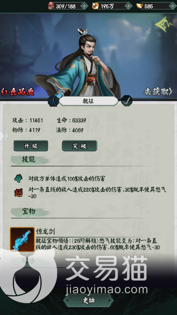 专属武器方面,魏征主要使用惊龙剑。该武器目前需要玩家们通过获取碎片之后来进行合成,自身拥有高额的进攻能力,在装备之后可以短时间内快速提升魏征的战斗力。各位可以直接进入到宝物商店当中去购买相关的碎片,同时也能够在后期解锁了除魔卫道副本之后,通过战斗去收集宝物碎片来进行合成。