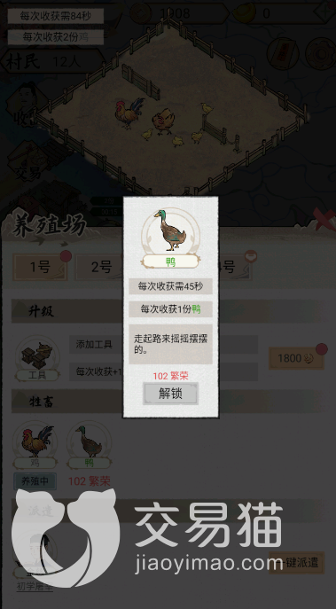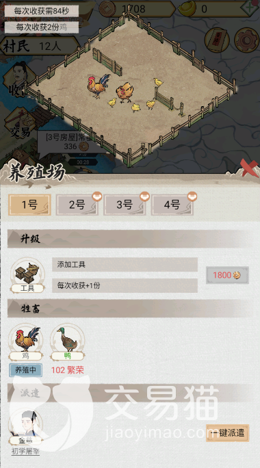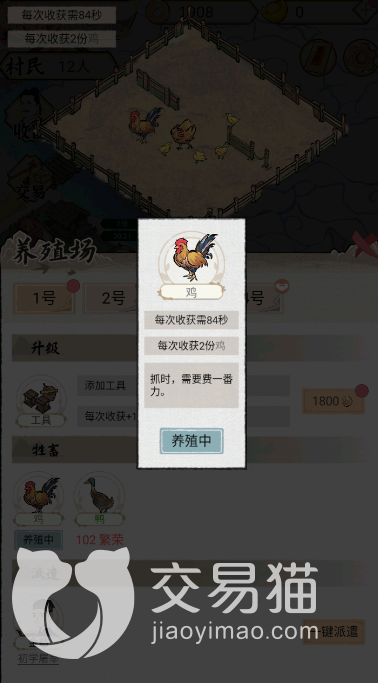 当玩家们刚解锁养殖场的时候,第一个能够饲养的动物就是鸡,同时也能够利用这些动物去合成游戏当中比较高级的消耗道具。当然,玩家们也需要派遣合适的村民进入到养殖场当中进行工作。建议大家在选择的过程当中,优先考虑拥有“初学屠宰”属性的村民,这一类将提高养殖场的整体工作效率。