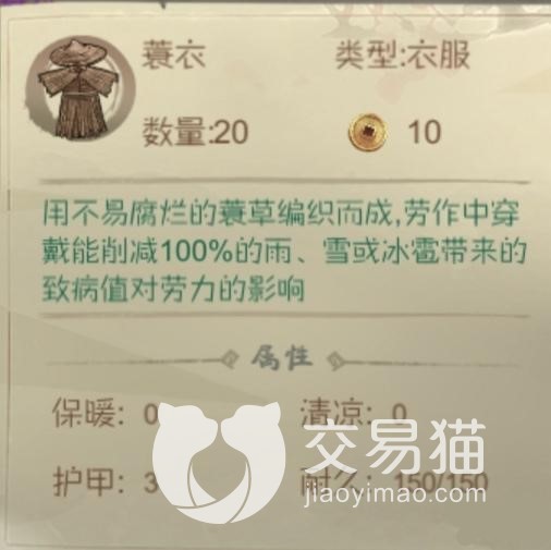 光想着治病怎么可以,应该要多想想要怎么预防,例如就可以为每个居民都备上一个保暖的衣服,其中蓑衣比较合适,因为它能非常有效的预防雨雪天气带来的影响,它的价格不是很贵,所以大家可以尝试获取一下。
