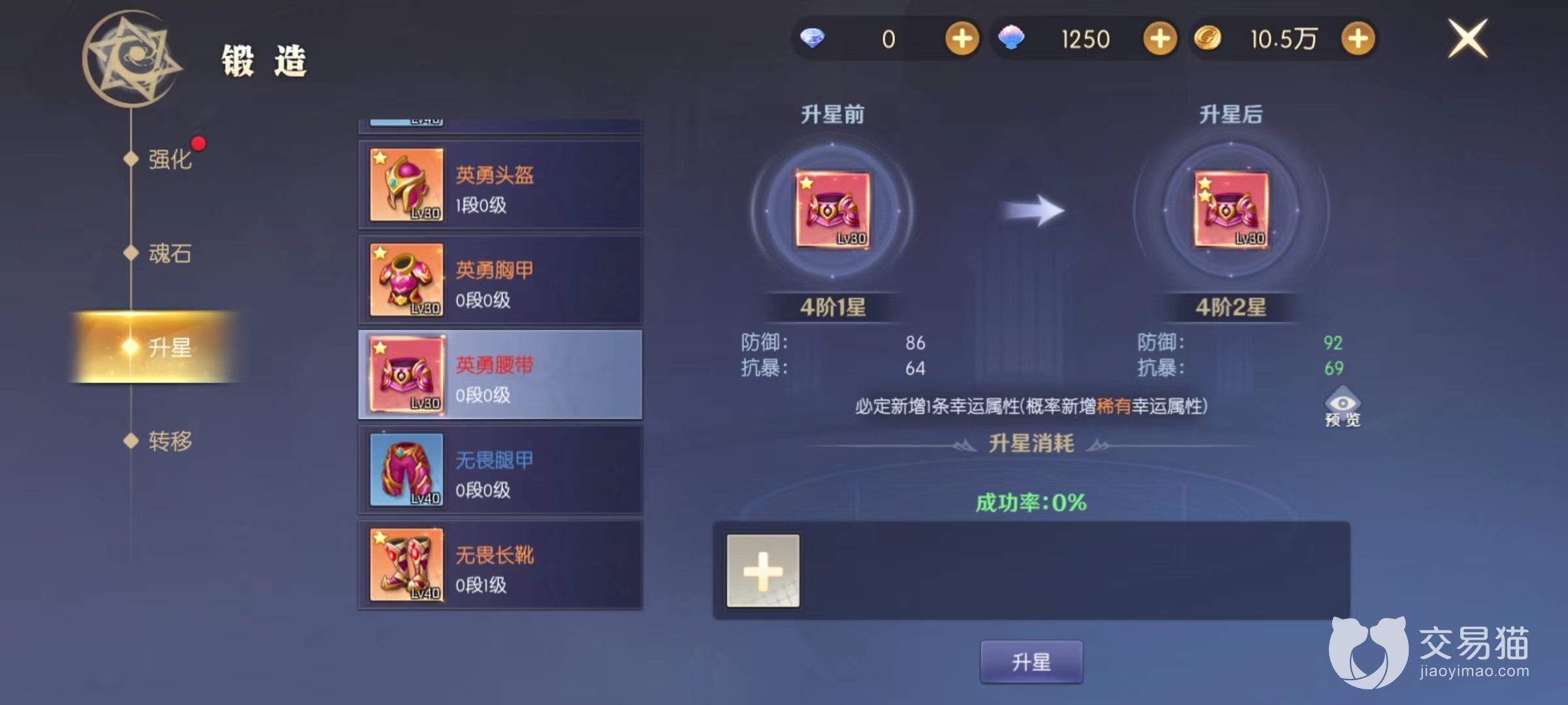 无论是通过哪一途径获得的装备大多数都是一星,需要在锻造中的升星操作里进行星级提升。升星需要消耗本职业同阶的其他橙色装备,在选重要升星的装备后,将其他的材料放到下方就可以点击进行升星了。提升之后可以随机获得多项属性,种类和数值完全随机生成,所以运气也非常重要。