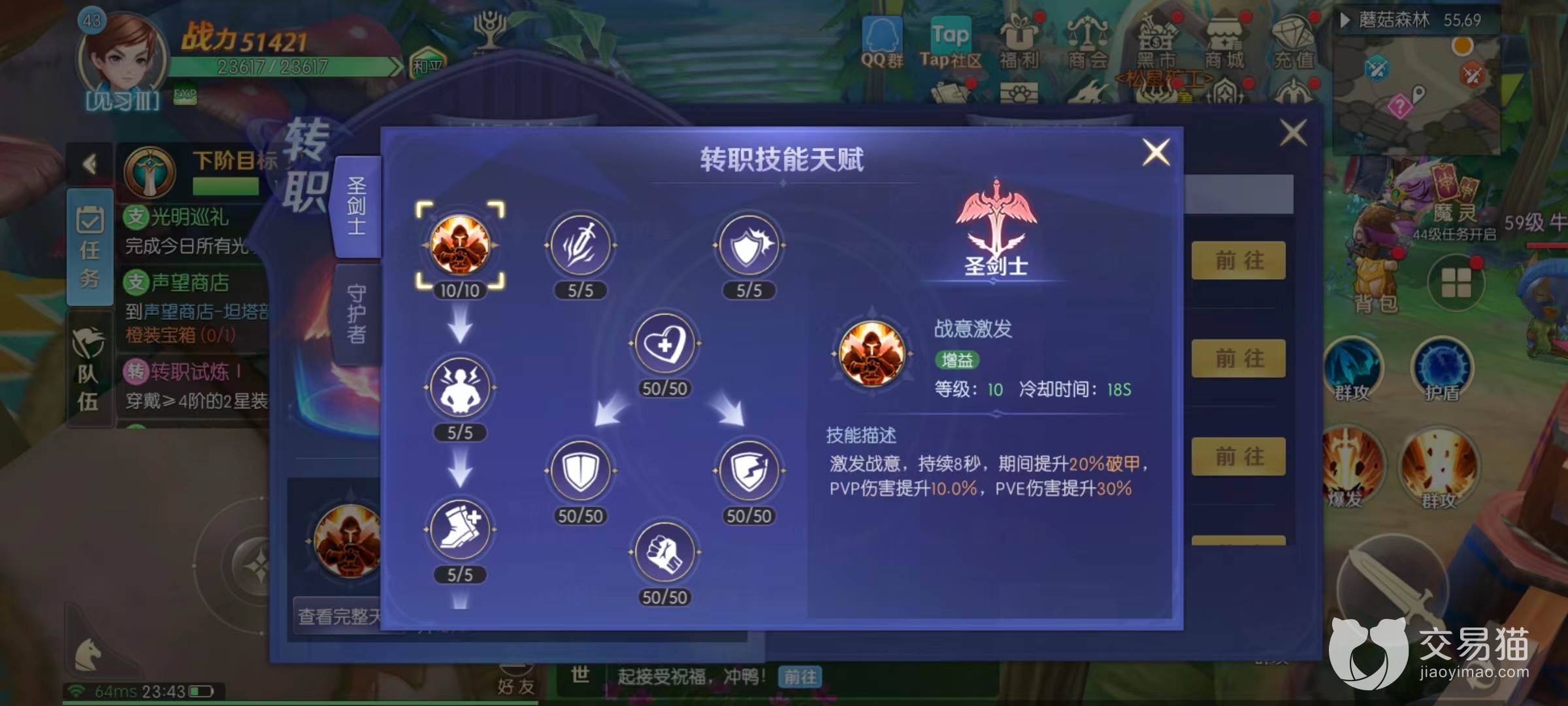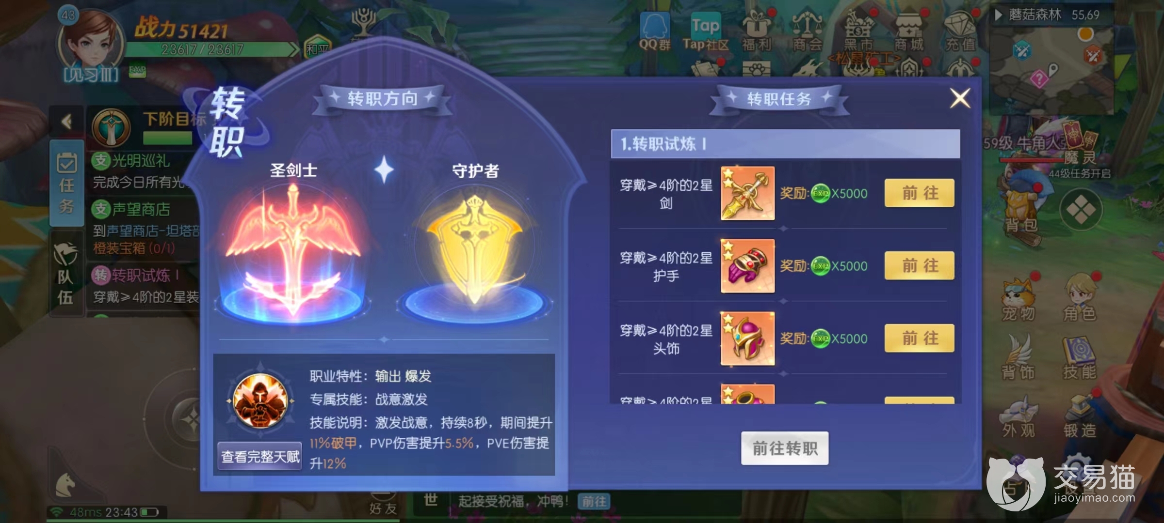 将身上所有的装备全部提升到指定的星级和品阶之后就能够点击前往转职完成任务之后最重要的就是选择转职的方向,小编这里以战士的转职为例来进行介绍,战士在转职后有两个方向分别是侧重输出和爆发的圣剑士,以及侧重肉盾和生存方向的守护者。之后技能和天赋也将发生变化,圣剑士能够获得专属技能,战意激发,激活之后在持续时间内提高破甲属性以及PVP和PVE伤害,而守护者的专属技能圣盾护佑,能够召唤出护盾保护自己,提高格挡值和防御属性。