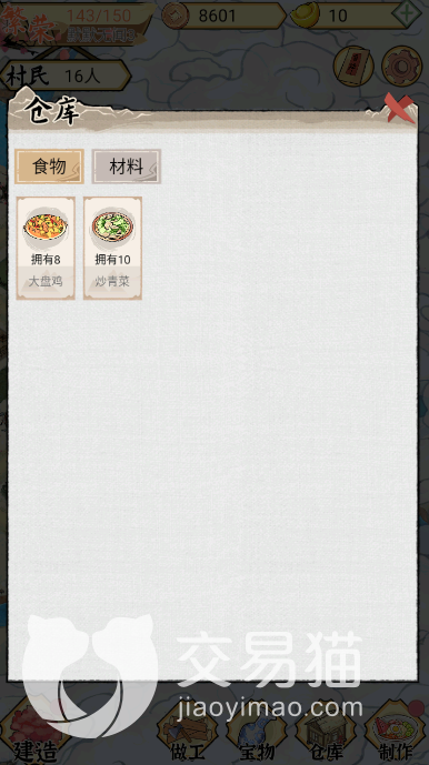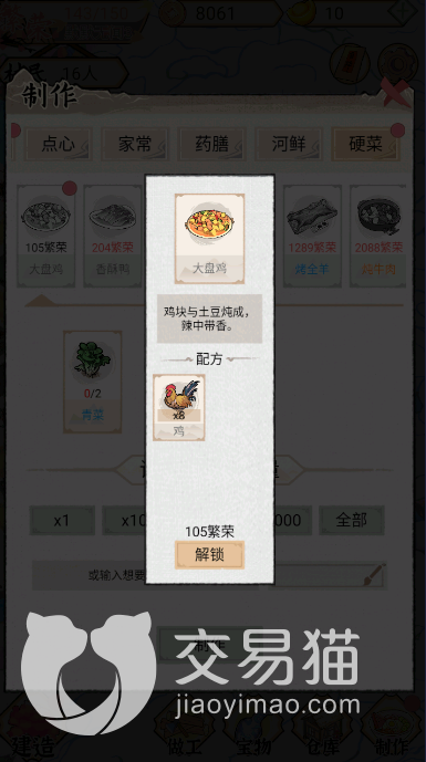 当各位顺利的准备好材料之后,就可以直接进行制作了,大家只需要进入到制作业面当中,选择好相应数量即可成功的获得大盘鸡。大盘鸡随后会进入到仓库当中,该道具作为主要的食材,后期主要应用于对关键村民的奖励,帮助人物提升体力值等。目前,暂时没有办法将大盘鸡使用在交易当中进行出售。