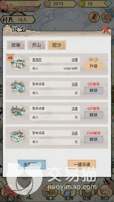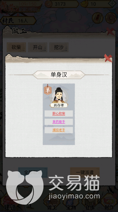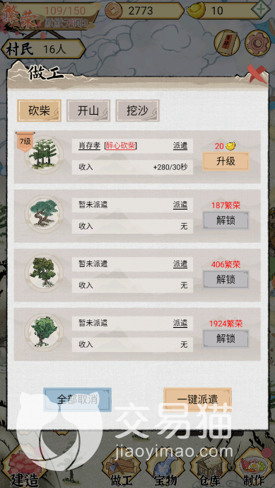 在主界面的最下方,玩家们可以看到三个做工场地,每一个场地都需要最低保持一个村民在工作,这样才能够让玩家们得到相关的做工材料。不过,根据做工类型的不同,玩家们在选择村民的时候也需要认真观察符合的属性条件,否则会导致做工的效率直线下降,所各位在派遣村民的时候需要认真筛选。