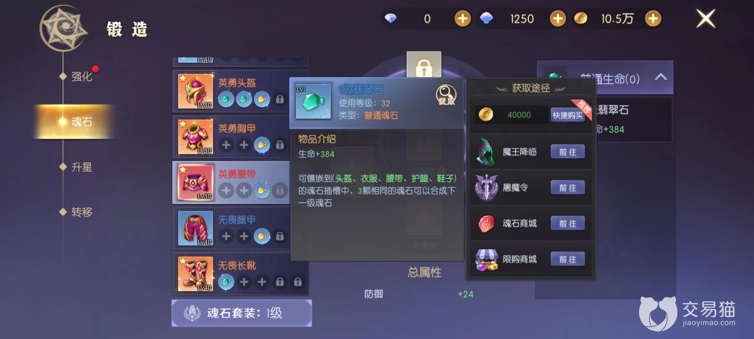 接下来是在装备上镶嵌魂石,通过提升角色等级和装备上魂石的总等级,能够解锁更多的魂石插槽,最多能够镶嵌5枚魂石。按照不同的属性分为血精石,紫光石,金刚石和翡翠石等4种类型,分别能提升攻击力,破甲值,防御值和生命值等属性。在这些属性中,血精石的地位无疑是最高的,要优先选择,可以镶嵌到武器,耳环,项链,戒指和护手等装备中。总之提升攻击的属性要比提升防御的收益更高,这一原则适用于装备强化的其他领域。