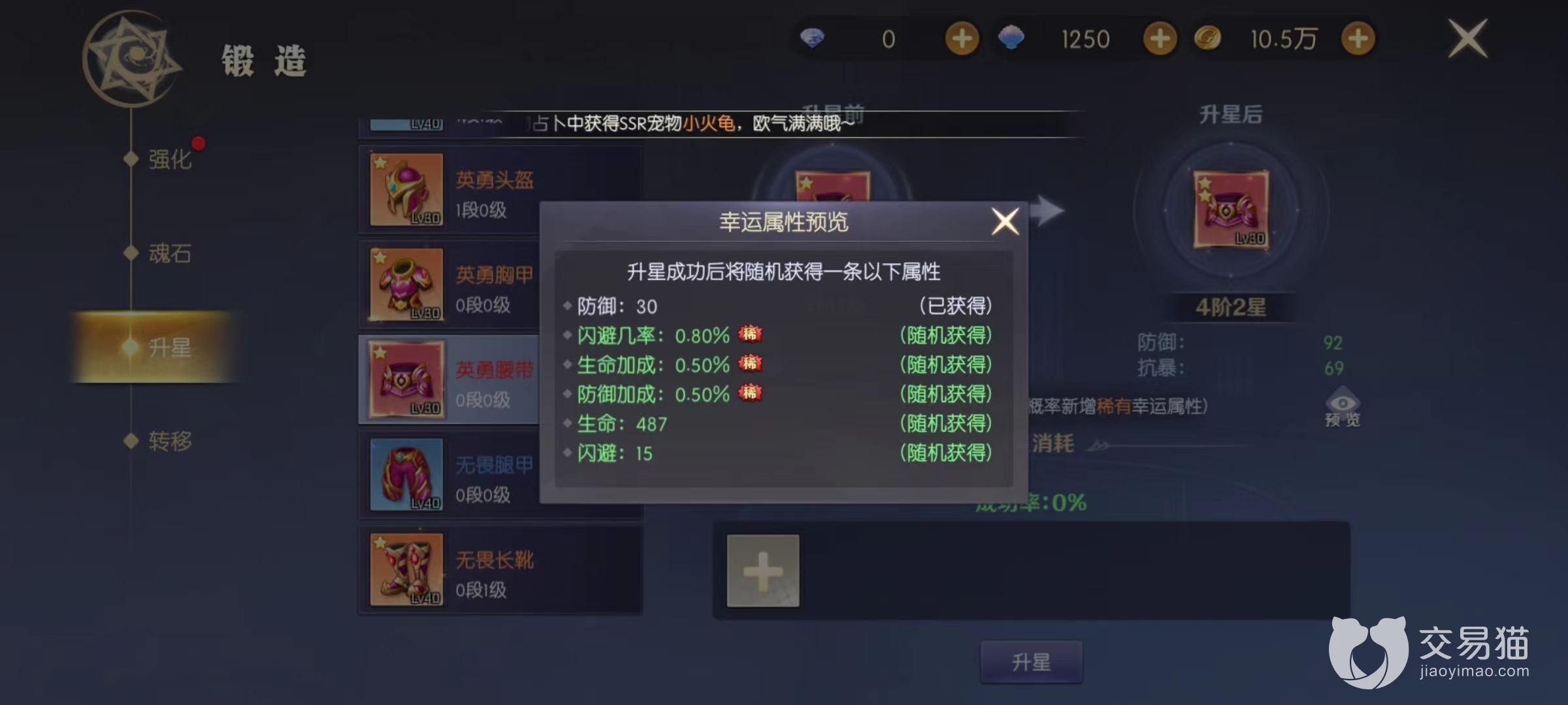 选择好魂石后还能进行等级提升,三枚同等级的同名魂石可以提升为更高等级,这里要遵循的原则是一定要将所有的孔全部镶嵌满,再开始均匀提升。同样为了触发魂石等级的套装效果,额外属性一定不能忽视。最后是装备升星,只有达到橙色一星及以上品质的装备才能进行升星,需要消耗同品质的其他装备,升星之后能够随机生成一条属性。因为是随机获得所以也有很大的运气成分在其中。
