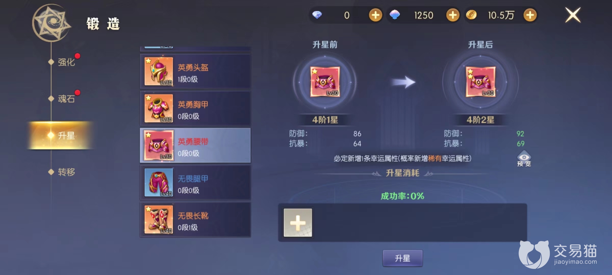 然后是装备升星需要达到橙色以上品质才能升星,升星之后有一定几率额外获得属性词条,消耗同名同品质装备可以有几率提高一颗星。这是只有在高阶装备时才会用到的方式初期不建议选择。