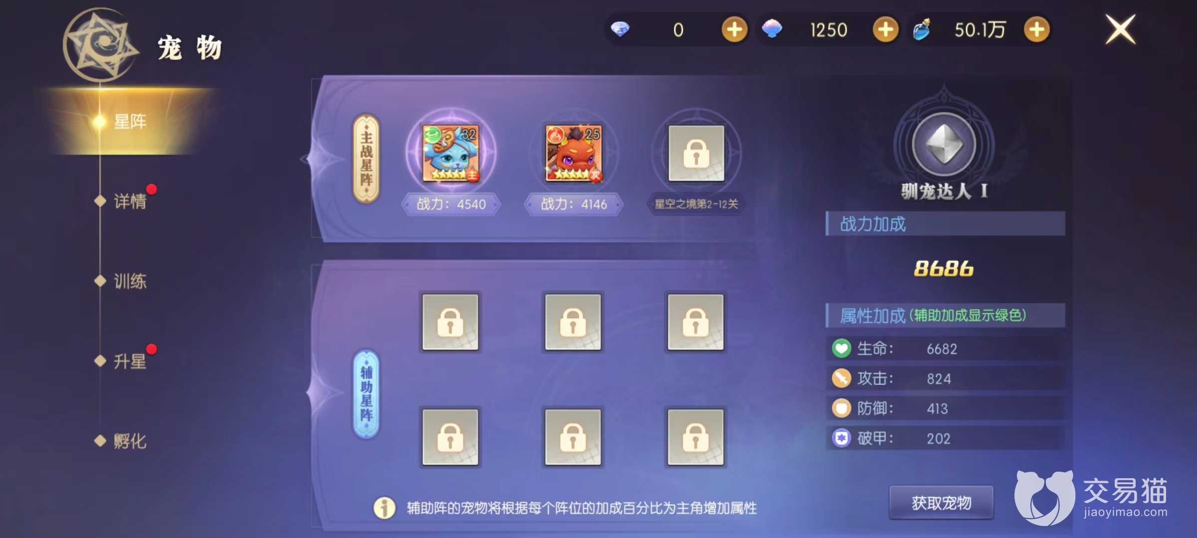 宠物也是不可忽视的一方面,通关星空之镜对应关卡后,最多能够选择3名宠物进入主战行列,还能选择6名宠物进入辅助行列。最重要的就是三名主战宠物,一定要选择SSR品级的橙色宠物,不仅技能效果好属性也很强力。在选择好宠物后还能进行等级提升,以及资质训练和升星强化。训练时只要当一条资质达到满级就能进行突破,只有不断的突破和升星,才能最终形成强悍的战斗帮手。