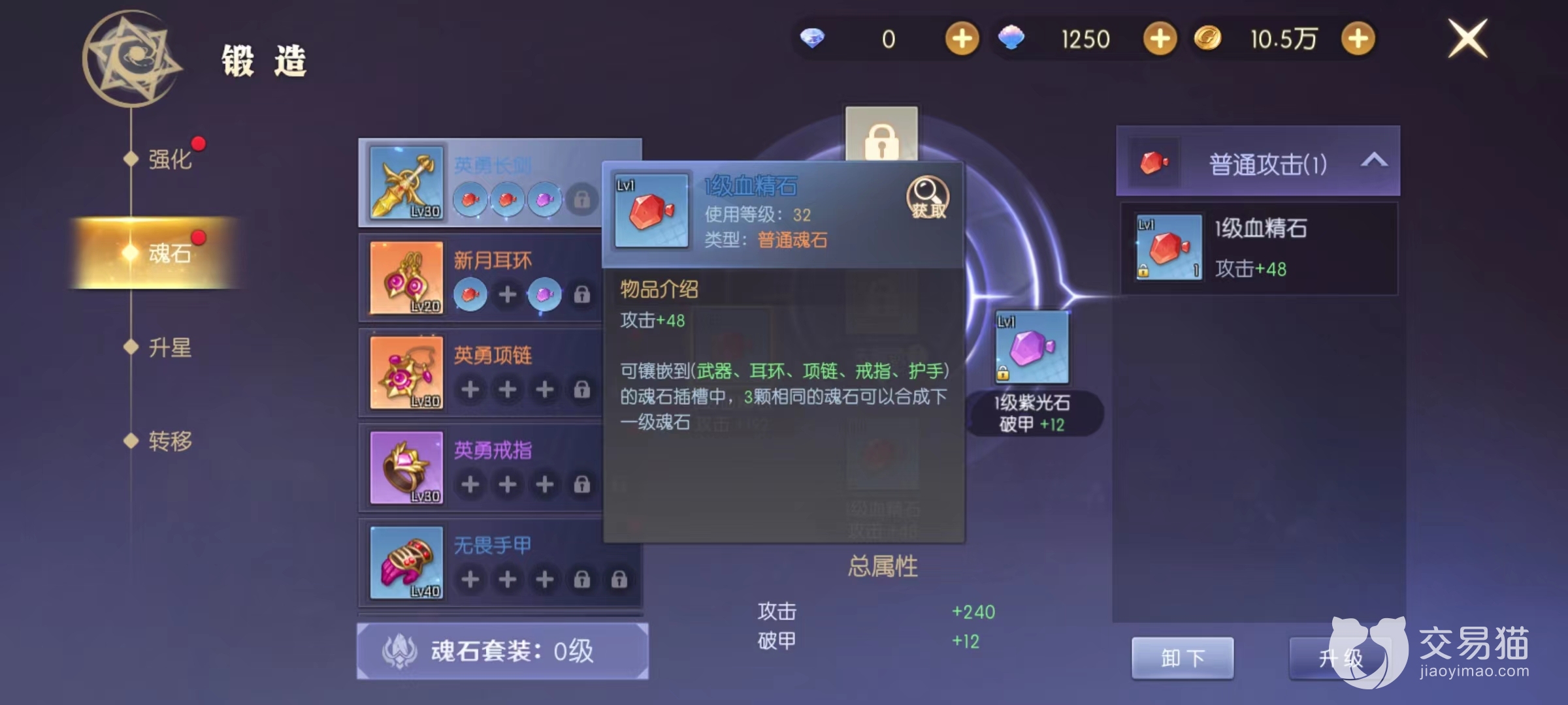 再就是镶嵌魂石,每一件装备都可以镶嵌5枚魂石,分别是提升攻击力的血晶石,提升破甲值的紫光石,提升生命值的翡翠石,提升防御的金刚石。在这4种属性中优先选择和升级加攻击力的石头,其次是生命值,然后才是破甲和防御。除了购买更多的魂石之外,还能够提升等级,相同等级的同名石头可以合成更高级的石头,属性大大提高。
