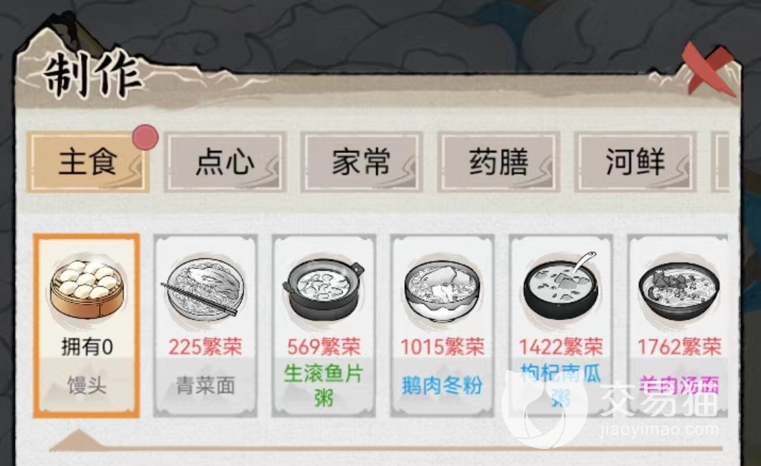 刚进入游戏后,点击主界面右下角的制作图标,就可以看到当前所有提供的食物第1栏就是主食,目前开放的主食有米饭,馒头,青菜面,生滚鱼片粥,鹅肉冬粉,枸杞,南瓜粥,羊肉汤面,白萝卜牛肉水饺,香辣虾炒饭等。