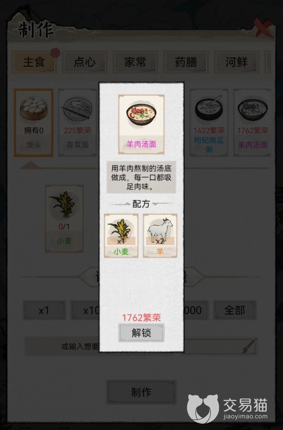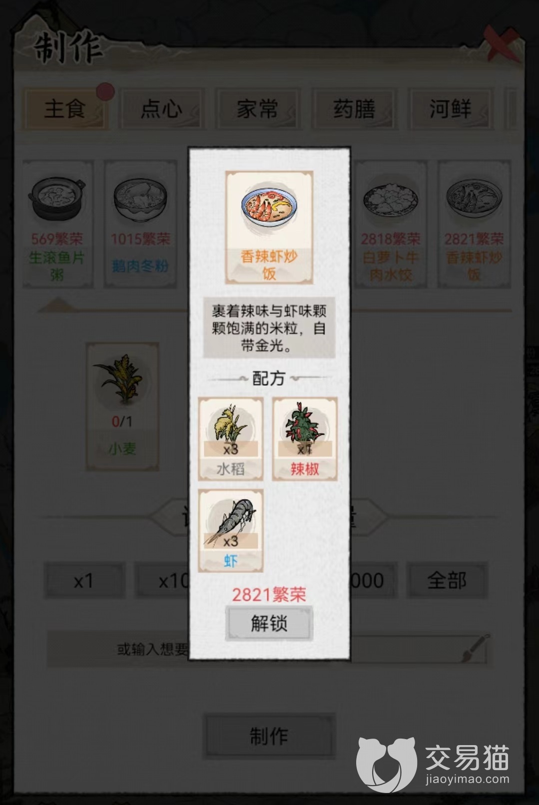 以上需要的这些食材都可以在自己的庭院中进行生产,各种植物能够在药田和农田里生产出来,水产品需要在水塘里饲养,家禽类在养殖场进行种植。选中对应的生产基地,然后可以逐渐解锁这些食材,当有了食材后就能开心地制作了,当然更加高级的主食也需要达到一定的繁荣度才能解锁。目前最顶级的主食香辣虾炒饭,需要达到2821点繁荣才能解锁。