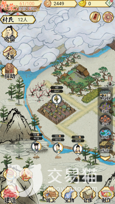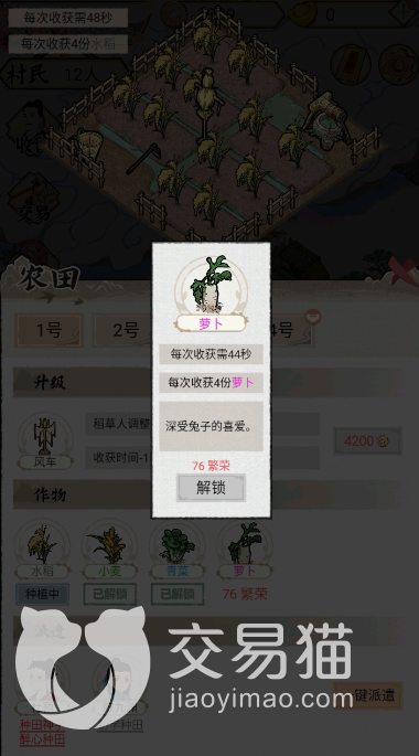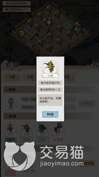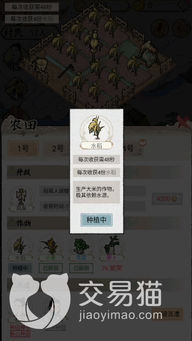 大家不要小看游戏当中的农田,各种基础的核心道具全部都需要从这里进行种植。尤其是前期各位缺少铜钱的情况下,利用农田直接大量种植水稻,然后在利用水稻合成米饭,就可以直接在市场当中进行交易,帮助各位获得更多的铜钱收益。当然,农田内不仅仅只可以种植水稻这样的道具。