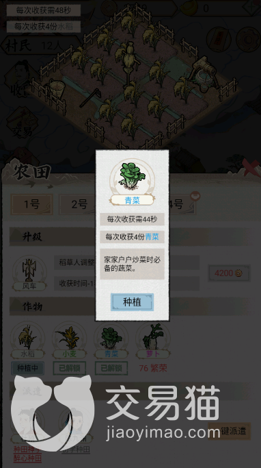 接下来解锁的则是青菜,与前两种物品有着非常大的区别,青菜主要是可以合成出一个炒菜道具,在后期可以用于补充村民的体力。玩家们如果想要让村民们的工作效率一直保持的话,那么就需要合理使用青菜来进行。同时,青菜的种植时间也会稍微久一点,但一次性得到的数量也非常可观。