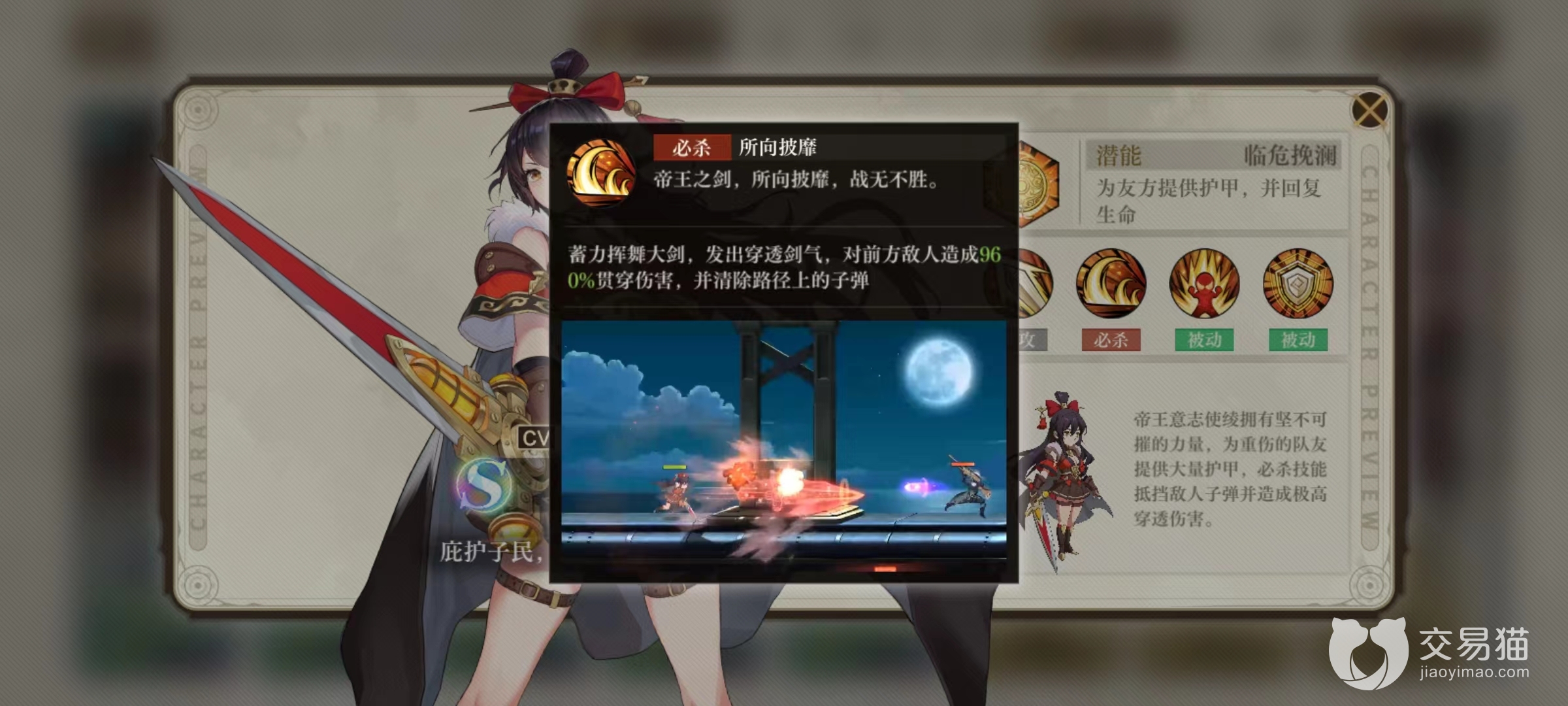 绫的普攻技能10年磨剑,对前方造成剑气伤害,攻击速度为每秒钟6发,属于中规中矩的输出伤害。必杀技所向披靡,直接将手中的大剑挥舞起来向前方发射出一道剑气,能够造成贯穿伤害,同时在经过的路径上会将所有子弹全部消除掉。这样在敌方数量比较多弹幕很密集时,能够直接将屏幕中的子弹全部清理掉,不仅给防御了伤害也为后面的队友提供了生存保证,是一个攻守兼备的技能。