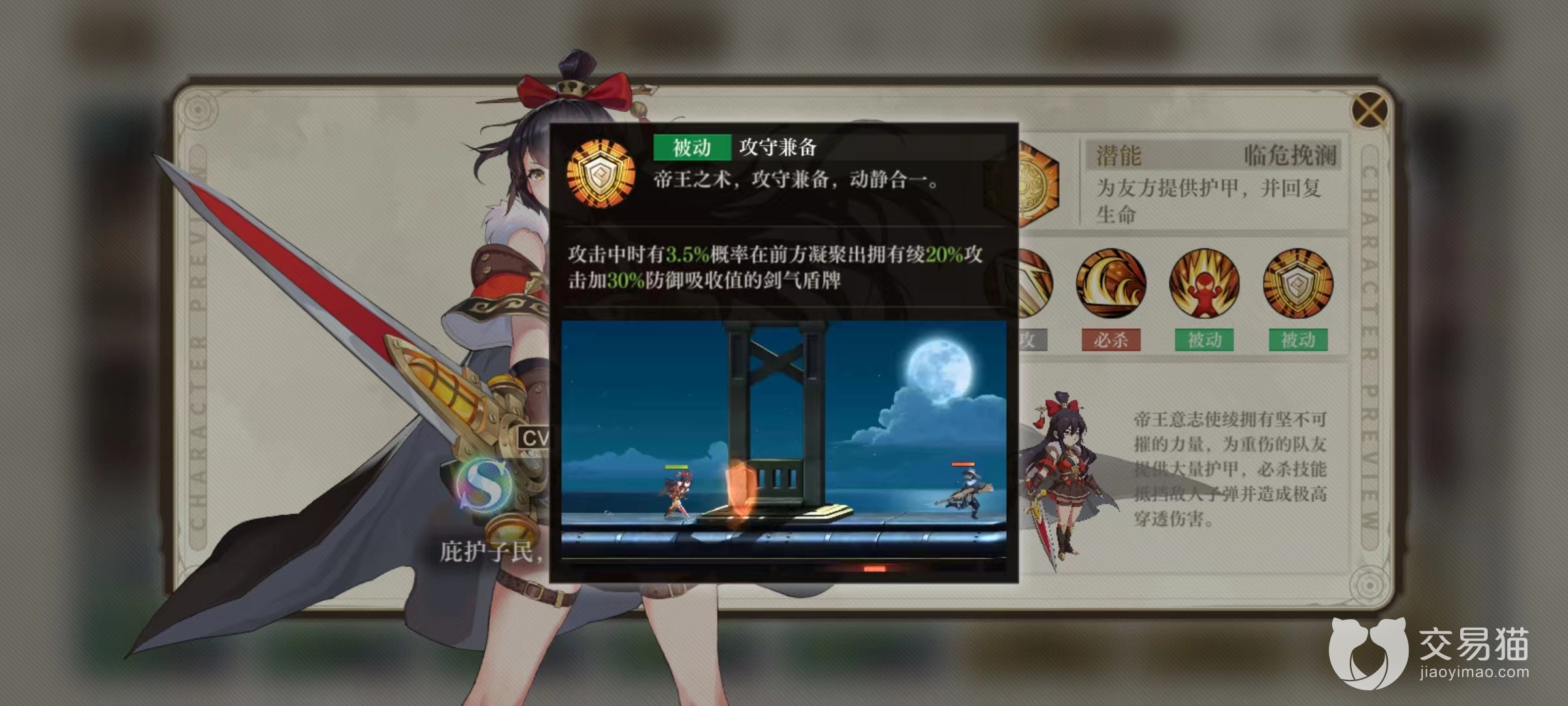 绫的被动九死未悔,作为拥有皇族血脉的继承人,可以直接在战斗中提升最大生命值,目前所有的防御角色被动都是提高生存效果,但是其他角色提升的是格挡,招架等属性,都不如绫的直接提升生命值来得更加实在,也是收益最高的一个。另一个被动效果攻守兼备,使得绫在攻击时有一定几率在前方释放出一个剑气盾牌,虽然防御范围比较狭小但是依然能抵消不少伤害。