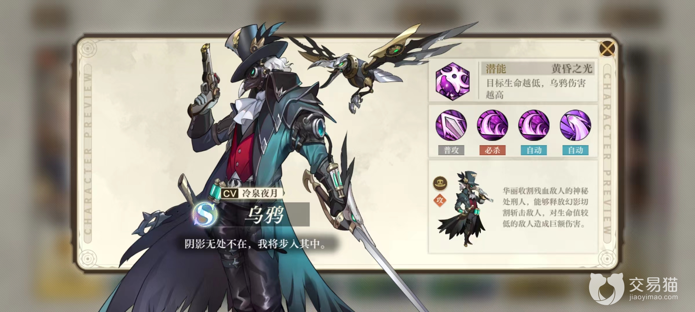 乌鸦非常擅长对残血敌人进行收割,潜能黄昏之光的效果是对血量过低的敌人造成额外伤害,同时能无视部分防御。必杀技能效果是对前方大范围内的敌人造成一次伤害,并且拥有两个自动攻击技能,伤害总体非常可观。