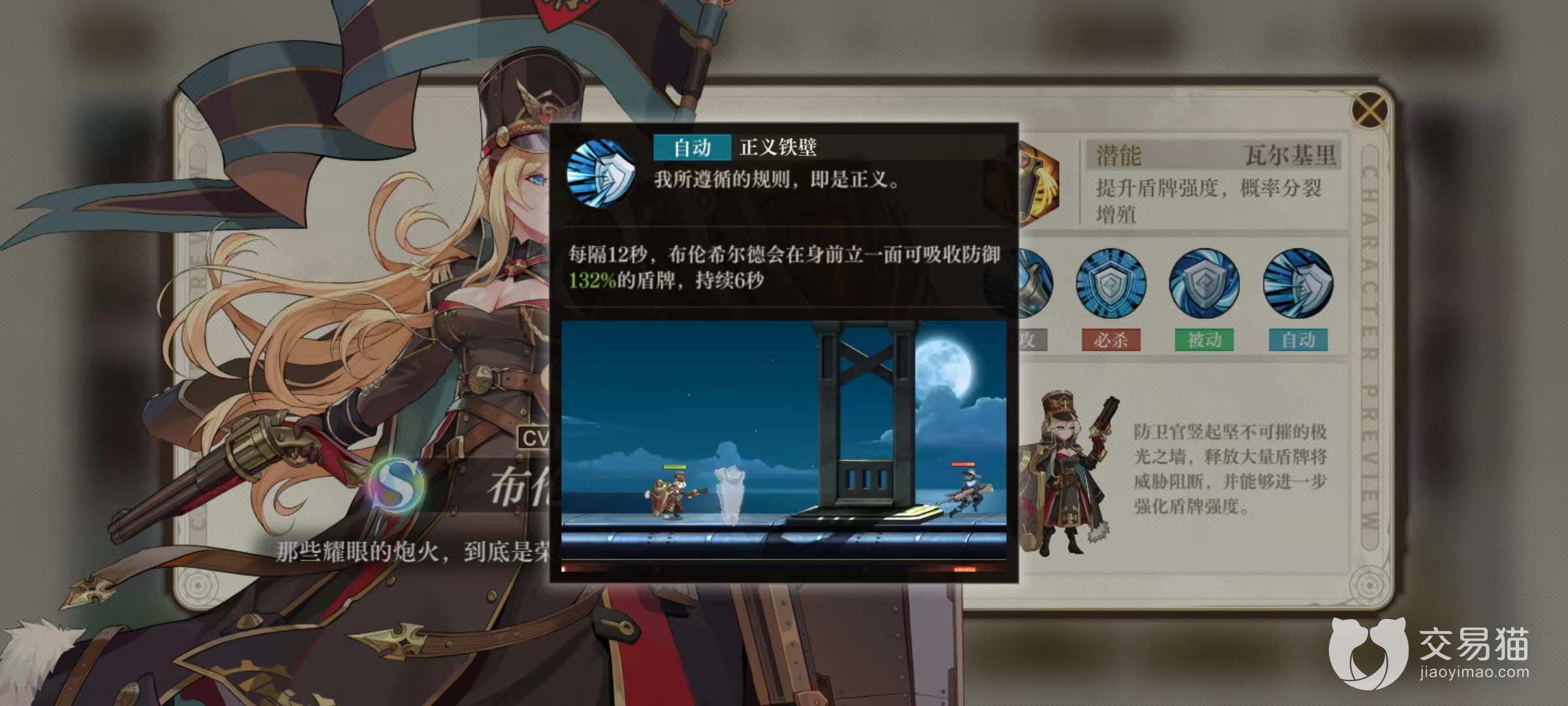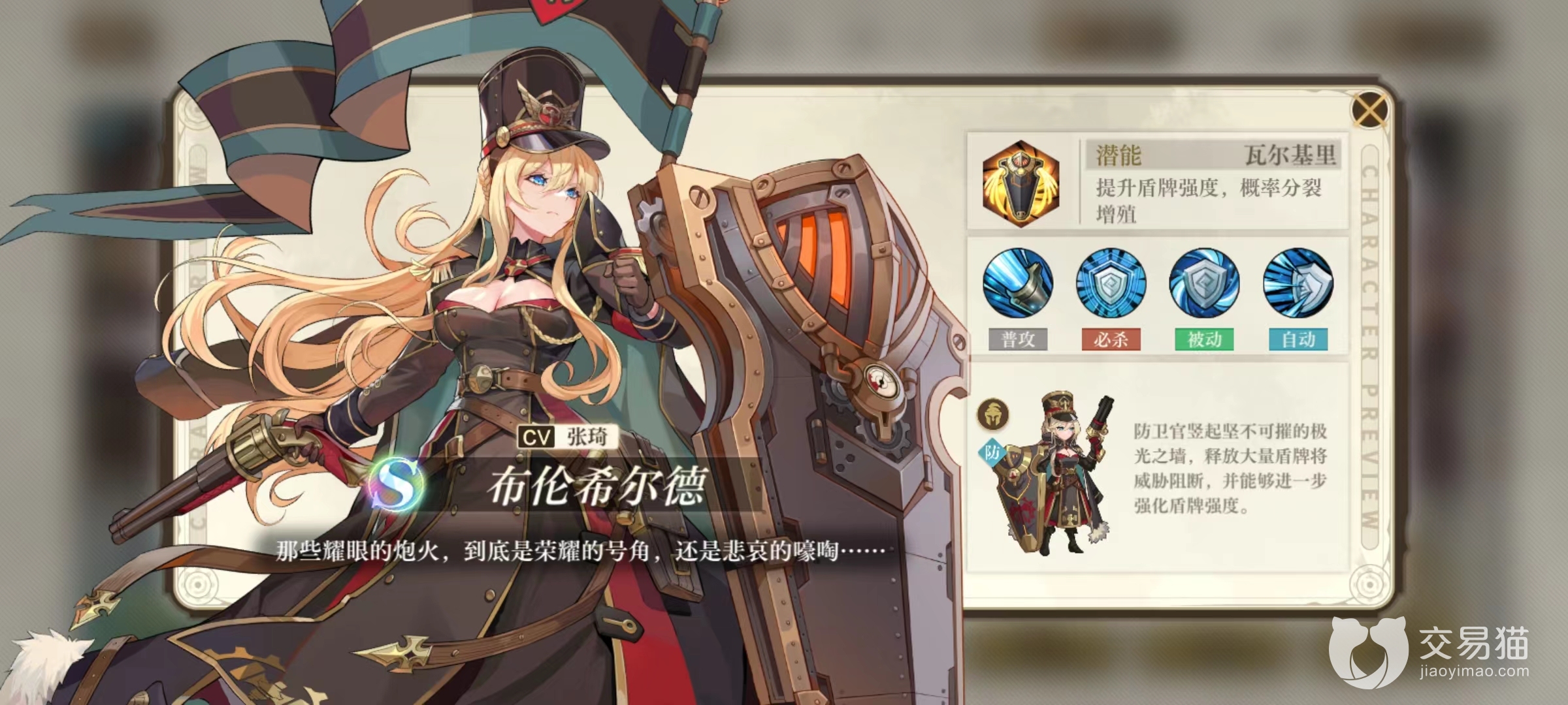 最后再被动技能防身体术的加持下,自身格挡属性提高20%。再就是布伦希尔德的潜力效果瓦尔基里,在释放盾牌后能够额外提升角色的生命值。如果觉醒到5阶,则所有盾牌都能免疫一次伤害,很好的强化了盾牌的防御效果。从技能总体效果来看,布伦希尔德输出比较疲软,但是防御方面非常出色,而且能够照顾到队友,这样在搭配时一定要选择强力的输出角色,长短互补。