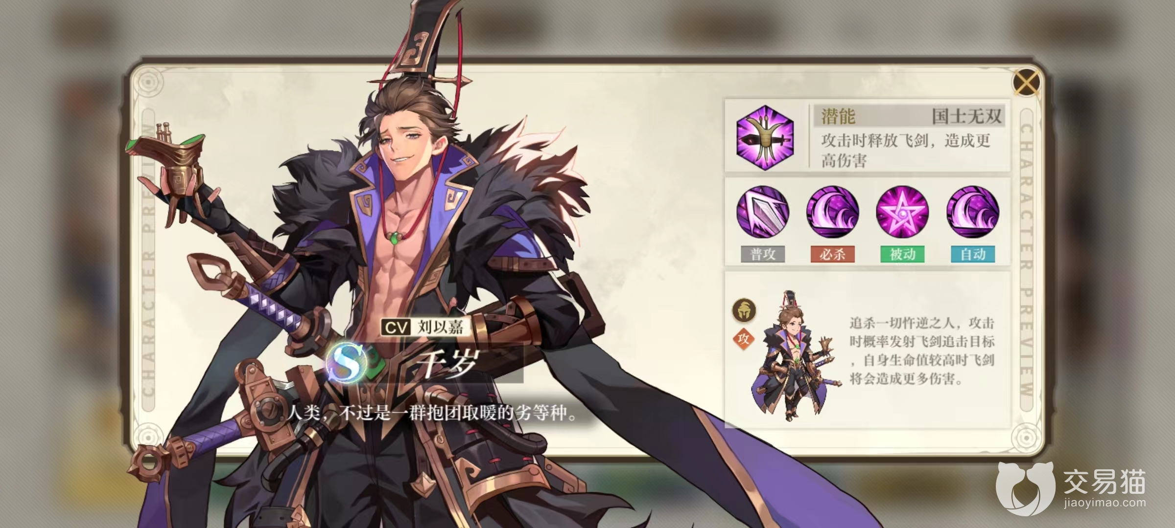 千岁的特点是伤害和自身血量相关,潜能国士无双的影响下,每次攻击都有几率释放飞剑对前方敌人造成伤害,同时千岁的血量越高,则飞剑的伤害也就越高。同时血量还和自身必杀技伤害相关,这就使得千岁在满血状态下能够打出最高输出,在布伦希尔德的庇护下完全可以做到少受伤害。当然这三名角色全部培养起来比较消耗资源,可以任选其中一两名,再搭配上一名辅助或是其他的a级输出,也能够达到很好的效果。