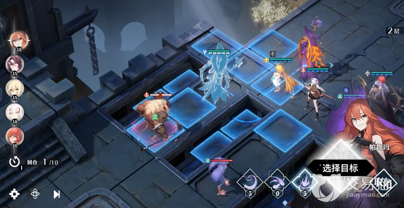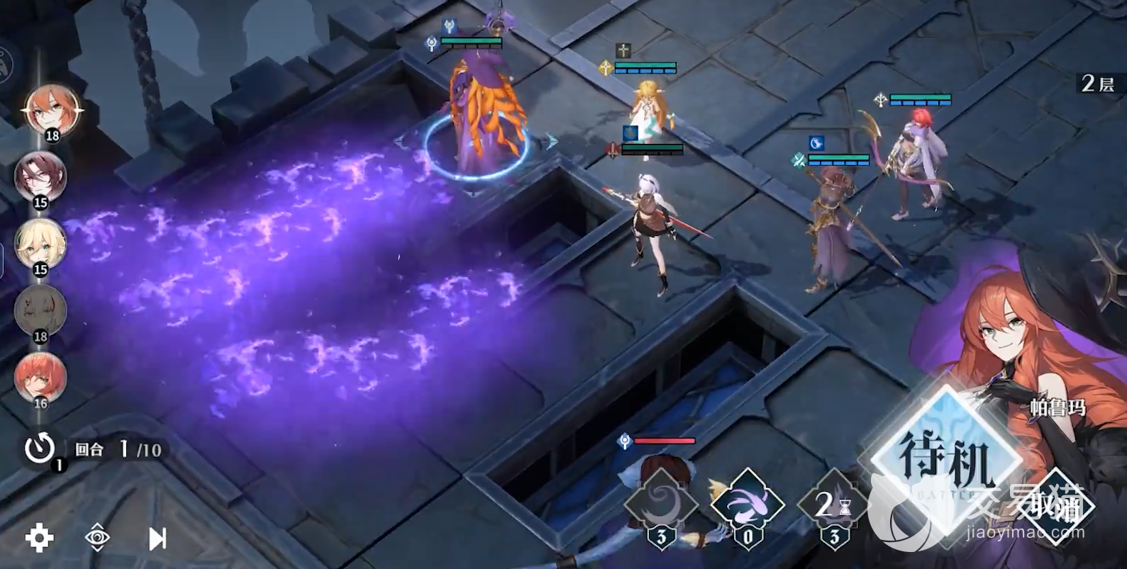 先看被动方面还不错,在主动攻击之前,为所有的敌方角色上一层名为禁咒魔力的特殊技能。这个技能持续时间为两回合,可以在敌方行动结束之后,对周围的一圈敌人造成15%的魔法攻击伤害。而且一旦敌方单位阵亡,就对其周围继续上一层禁咒魔力。