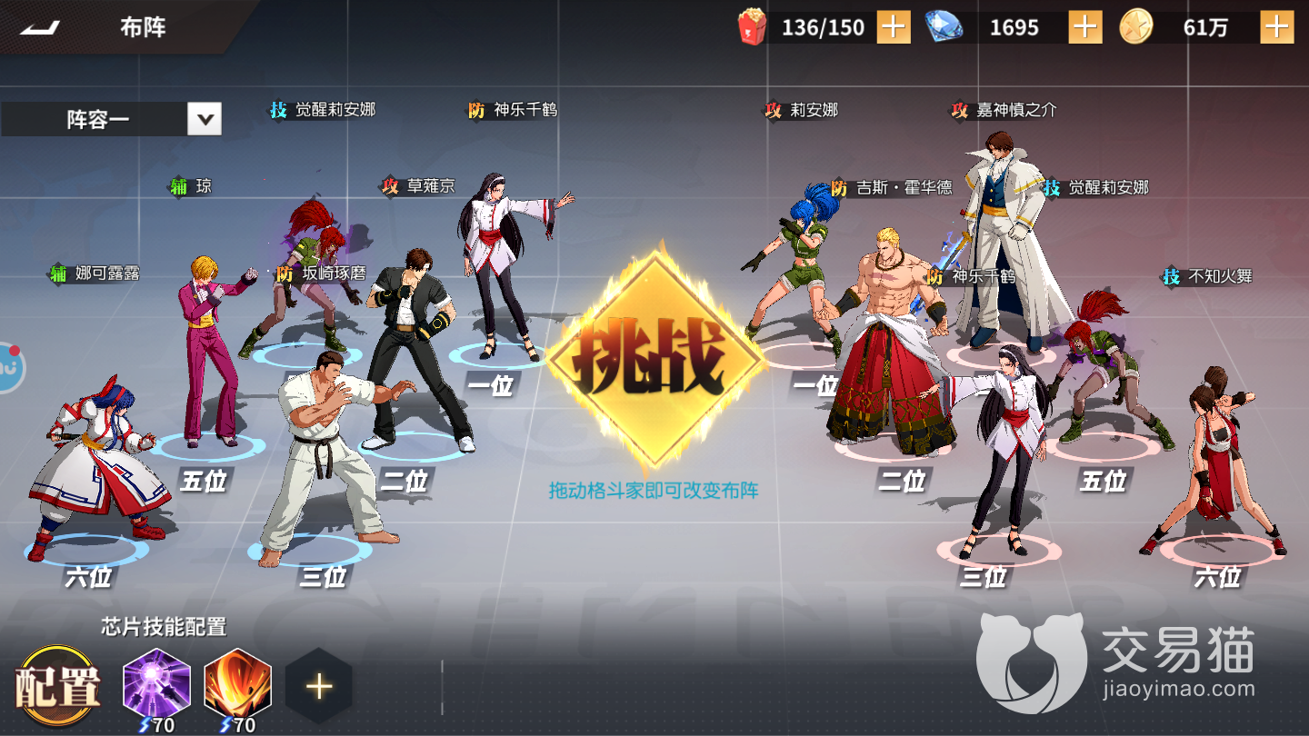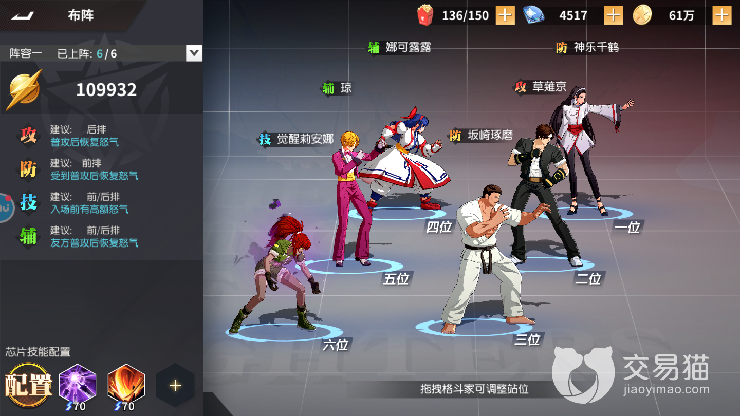 1【紫加蓝角色组合】:该游戏的紫色角色就是sr角色像是著名的登陆就送的【草稚京】是平民玩家输出的主力选手,蓝色角色就是游戏里属性最差的角色品质为R著名的有扫把头的【二阶堂红丸】还有【麻宫雅典娜】都是这个品质所以在游戏当中其实还是有一些使用的余地的,前期的新手教程里面也会显示让玩家带上这三个角色组成一个队伍再带上一个坦克就剩下两个位置了可以放两个输出一个是【技】一个【攻】就是一个完美的队伍了,当然玩到后面的关卡队伍肯定是要发生调整的。