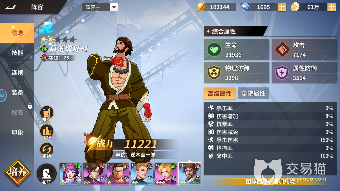 2.【全紫角色组合】:到达这个时候玩家基本上可以开启抽卡了,这次游戏开服赠送了许多的抽卡券只要满足足够的要求可以拿到手软这个时候开启抽卡获得紫色的概率贼高,玩家基本上能即将队伍的角色全换成紫色品质,战力可以达到巨大的提升,还能乘机将【草稚京】升一下阶级获得更多的伤害型的被动,这个队伍到最后的pvp也是可以作为三队上场的玩家可以好好琢磨一下紫色队伍的搭配。
