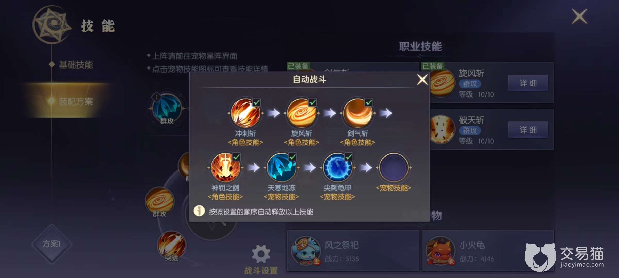 宠物技能同样可以在自动释放中穿插进角色的主动技能里,方式同样是以拖动的形式改变顺序,这样的组合才能达到更好的效果。但是上阵宠物的主动技能搭配需要在宠物页面中进行查看,在详情后可以观察到所有宠物的主动技能效果,然后选择其中自己最需要的三个出战。宠物技能主要分为群攻技能,防御技能,回血辅助等多种效果,建议每样选择一个携带这样能够弥补人物技能的不足。
