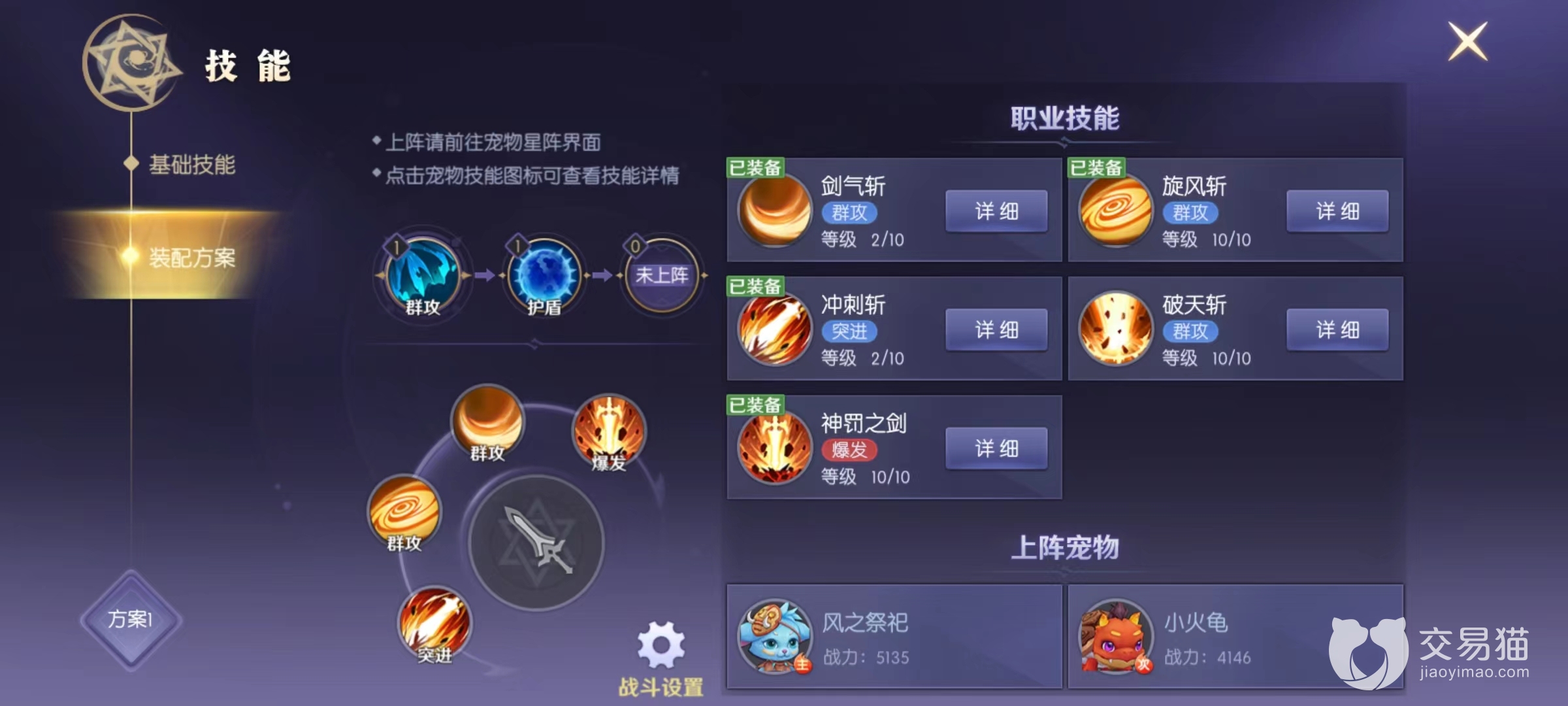 在初始职业中每一名角色拥有5个主动技能,每一个主动技能还有一个对应的被动。被动无需出战就能生效,所以我们需要在5个之中选择4个,具体选择顺序各个职业和不同战斗中都是不一样的,这里小编不再过多讲述。根据需要选择好之后,点击技能页面下方的装配方案,就可以对人物技能进行调整。与此同时宠出战宠物的主动技能同样可以在这里进行装配。