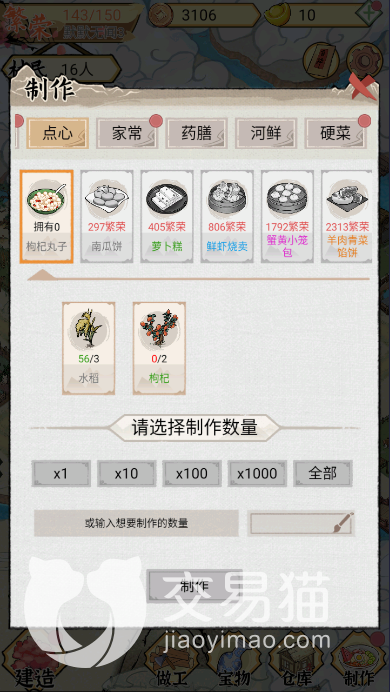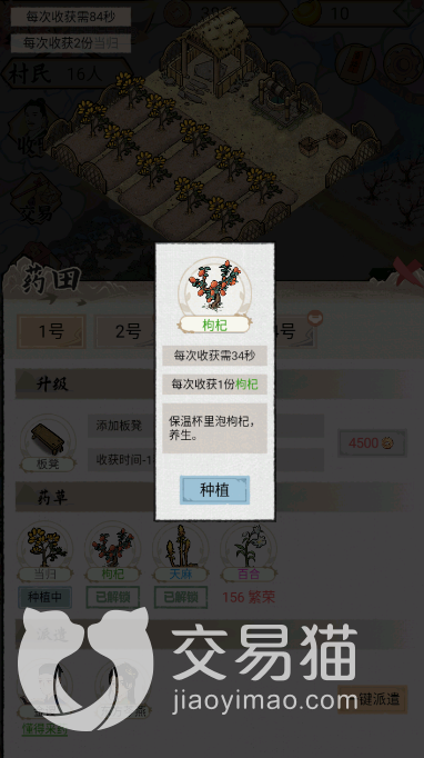 当道具准备充分之后,各位就可以进入到制作页面进行合成了,建议大家直接将所有的库存都全部进行合成。结束合成后,玩家们就可以进入到交易中,将所有的枸杞丸子进行出售,这一阶段就会帮助各位获得大量的铜钱。尤其是后期因为建筑升级导致铜钱不足的玩家,依靠枸杞丸子可以很快累积自己的财富水平。