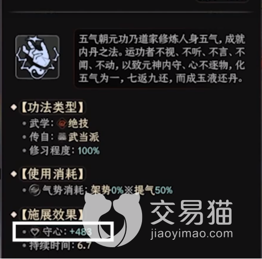 接下来我们介绍下武当派的【五气朝元功】,五气朝元功可以提供大量的守心属性,抵御对方的攻击,开启五气朝元功后,你就可以发现无论术方的普通攻击还是心神伤害,都可以抵御。另外术方本身是比较弱外伤的,拿一把铁剑之类的外伤100%的武器,可以快速打入第二阶段。