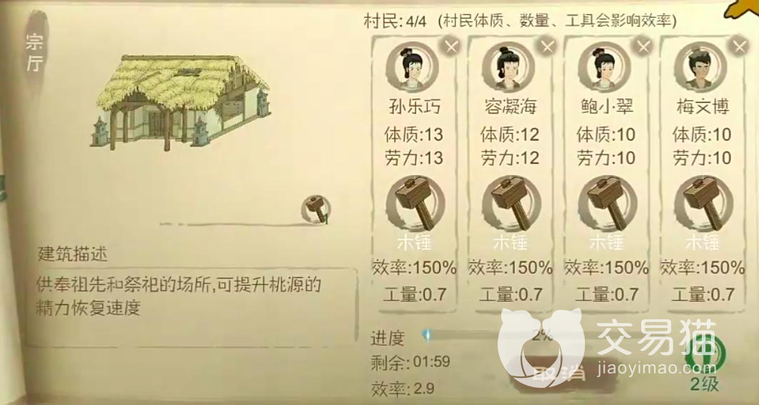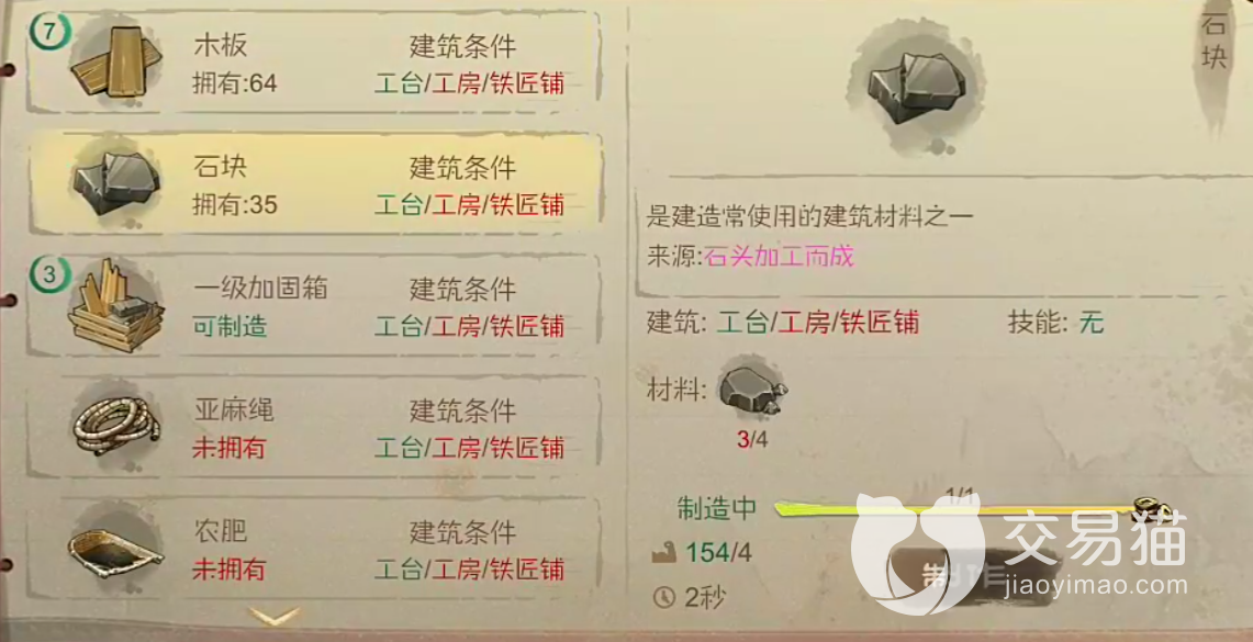 而当一个村庄里有木匠的时候,玩家就可以用更少的时间做出各种工具,这里的工具不仅是木制的,一些石制的也能够制作。有时候需要的一些特殊工具也是可以通过他们制作出来的,所以说这个技能是很有用的。