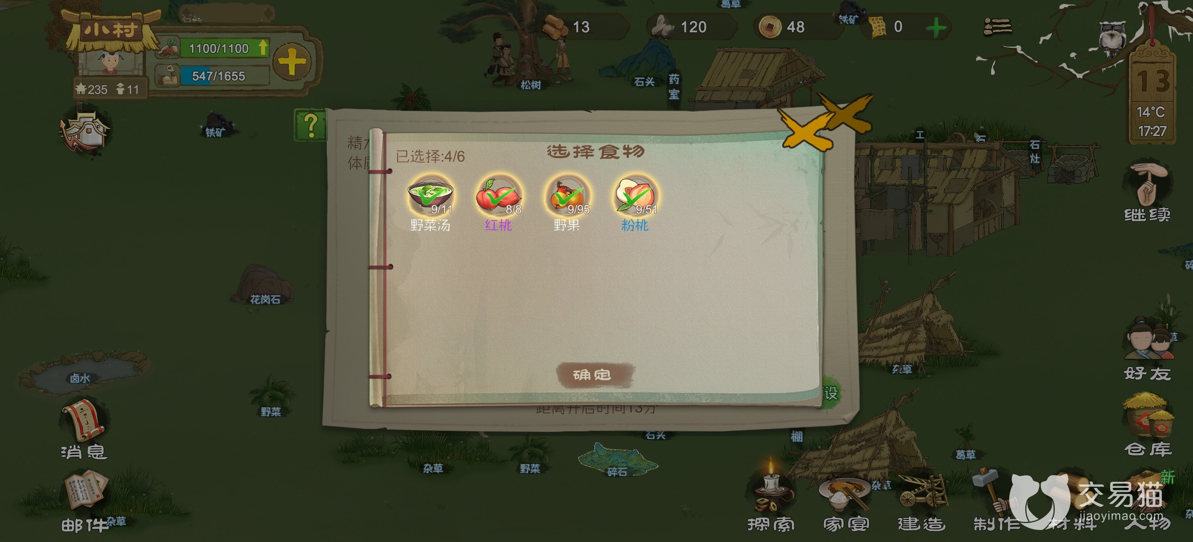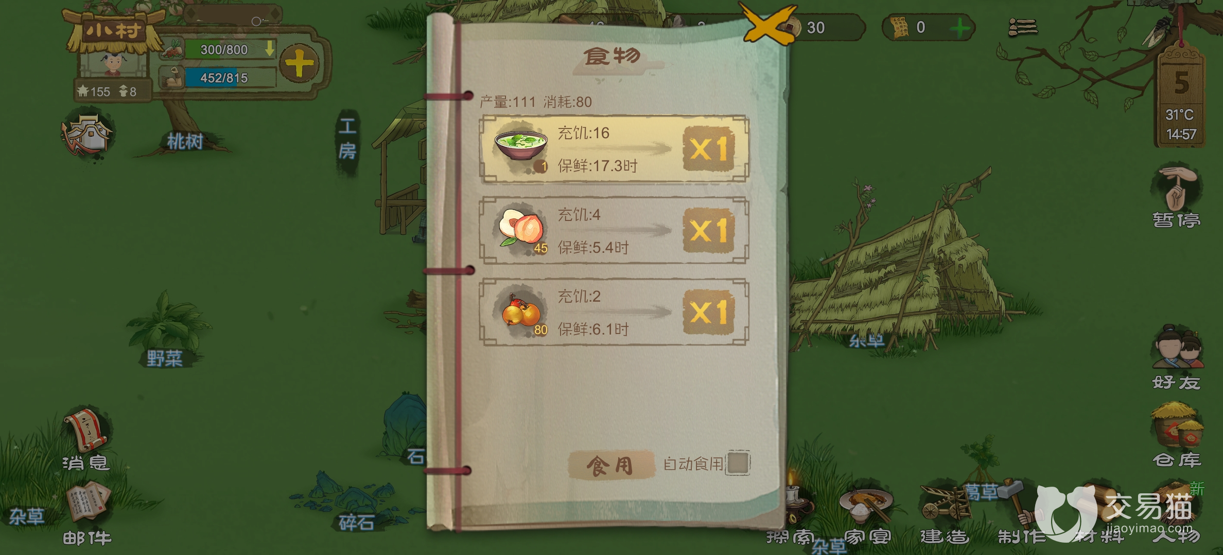 不想每次都自己投喂的小伙伴,可以尝试使用喂食按钮右边的自动投喂功能,这样就不用担心那些村民将自己饿死了。在游戏后期玩家开启一系列的功能以后,就可以将在仓库汇总的树木界面看到现有的食物,这里是一些制作好的菜品,也是能投喂给村民的。